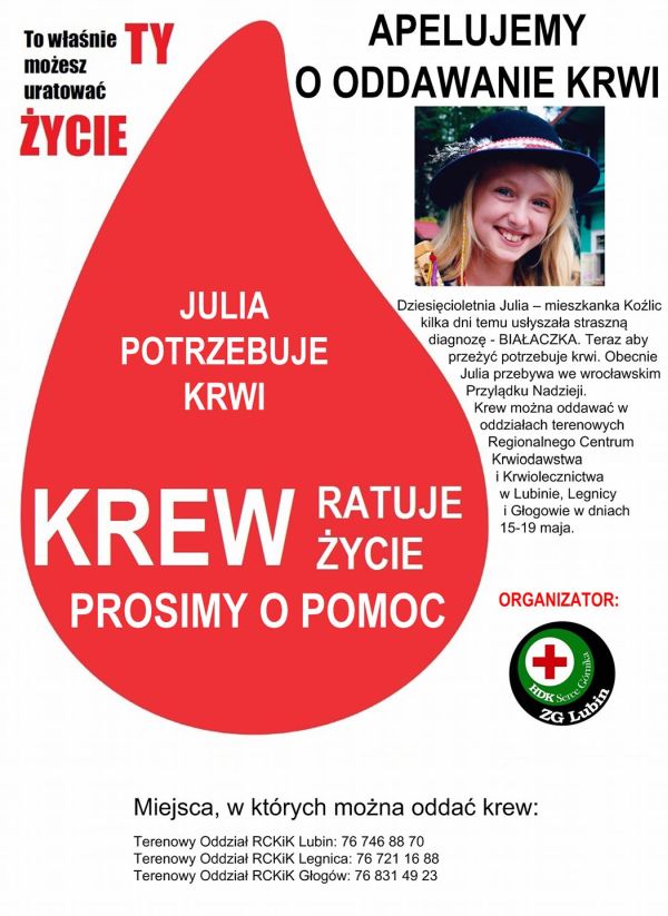 Z kolei Stowarzyszenie Klub Kibica Cuprum Lubin wraz z wolontariuszami Fundacji DKMS będzie rejestrować dawców podczas V Memoriału im. Kingi Resiak, który odbędzie się 20 maja w hali sportowej przy ul. Składowej w Lubinie w godzinach od 10 do 13. – Zapraszamy wszystkich, którzy w ten sposób zechcą okazać Julii i jej rodzicom, że nie są sami. Możemy w ten sposób wspomóc również inne osoby potrzebujące przeszczepu szpiku w walce z tą okrutną chorobą – zachęca prezes klubu Dariusz Stasik.