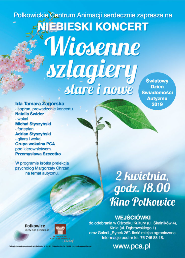 – Artyści zagrają z okazji Światowego Dnia Świadomości Autyzmu – informują organizatorzy z Polkowickiego Centrum Animacji. – W programie obok znanych i lubianych wiosennych pieśni przygotowaliśmy również krótką prelekcję psycholog Małgorzaty Chrzan na temat autyzmu. Na scenie wystąpią starsze i młodsze pokolenia, które wspólnie zabiorą wszystkich w sentymentalną podróż.