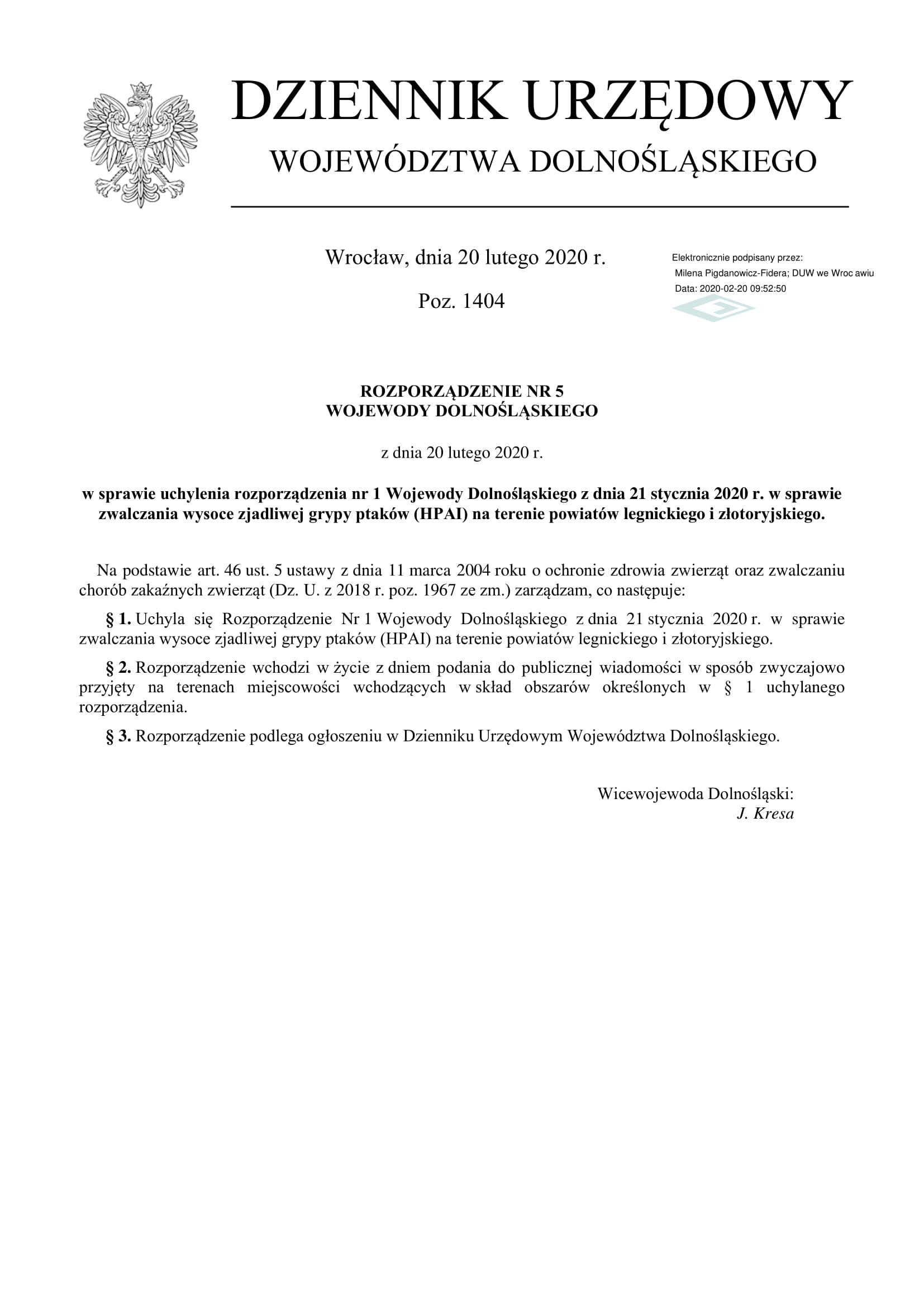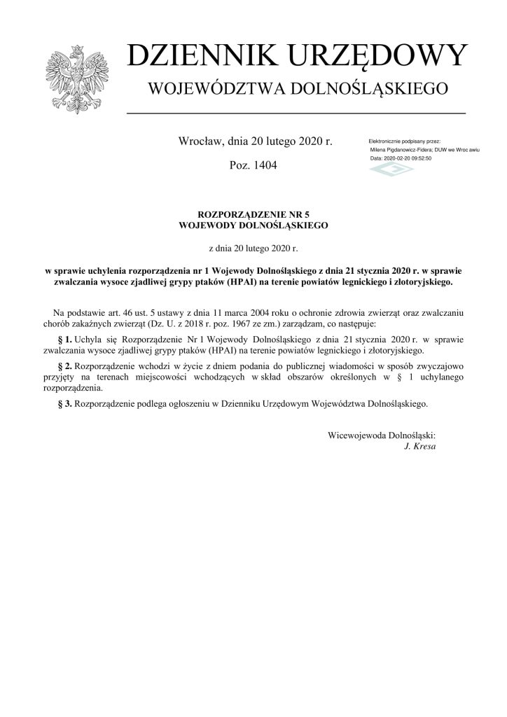 Uchyla się Rozporządzenie Nr 1 Wojewody Dolnośląskiego z dnia 21 stycznia 2020 r. w sprawie