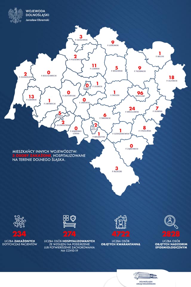 Pozostali nowo zdiagnozowani w naszym województwie pochodzą z Wrocławia i Jeleniej Góry oraz powiatów: wołowskiego, strzelińskiego, lubańskiego, wrocławskiego, świdnickiego i górowskiego.