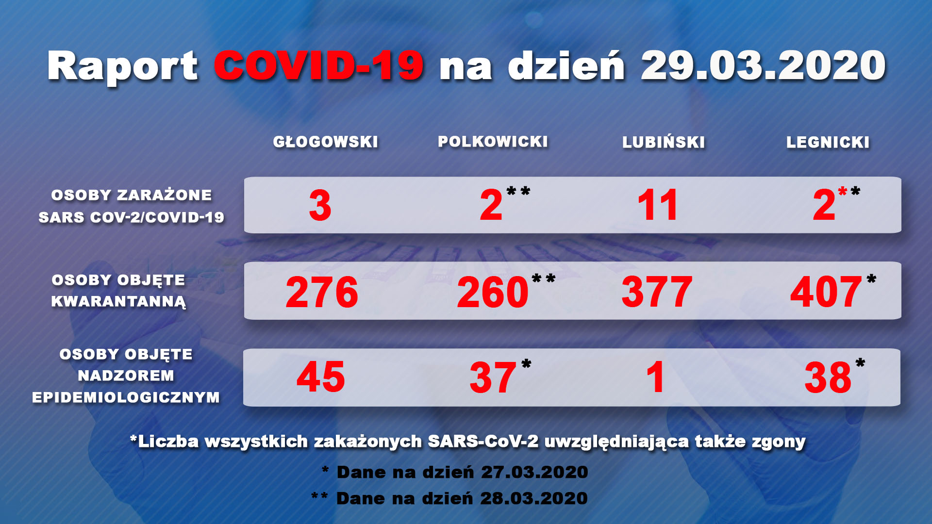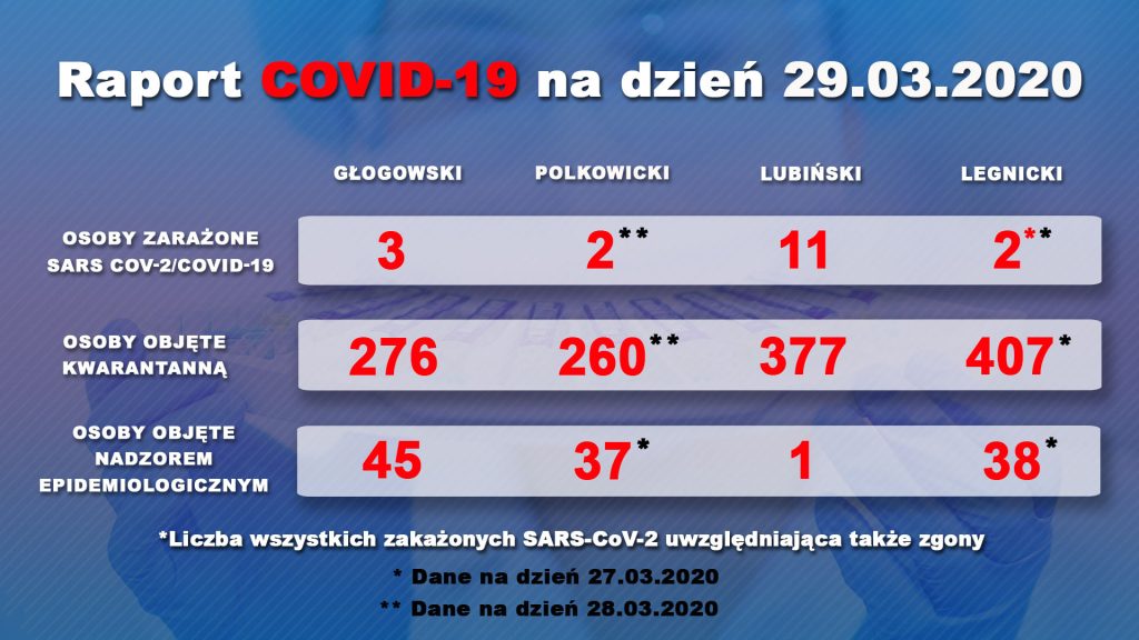 Powiat złotoryjski i jaworski wciąż pozostają jedynymi powiatami w naszym regionie, gdzie nie odnotowano jeszcze przypadków koronawirusa. W tej klasyfikacji dominuje powiat lubiński (11 zakażeń). Gdy idzie zaś o całe województwo, to najwięcej zachorowań wykryto we Wrocławiu (96).