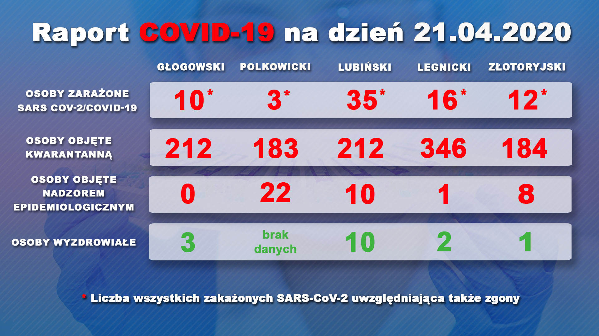 W subregionie legnicko-głogowskim przybyło dzisiaj dziewięciu nosicieli: po 4 w powiecie głogowskim i lubińskim i 1 w Legnicy. Stan większości z nich jest dobry. Przyczyną ich zakażeń był kontakt z osobami zainfekowanymi.
