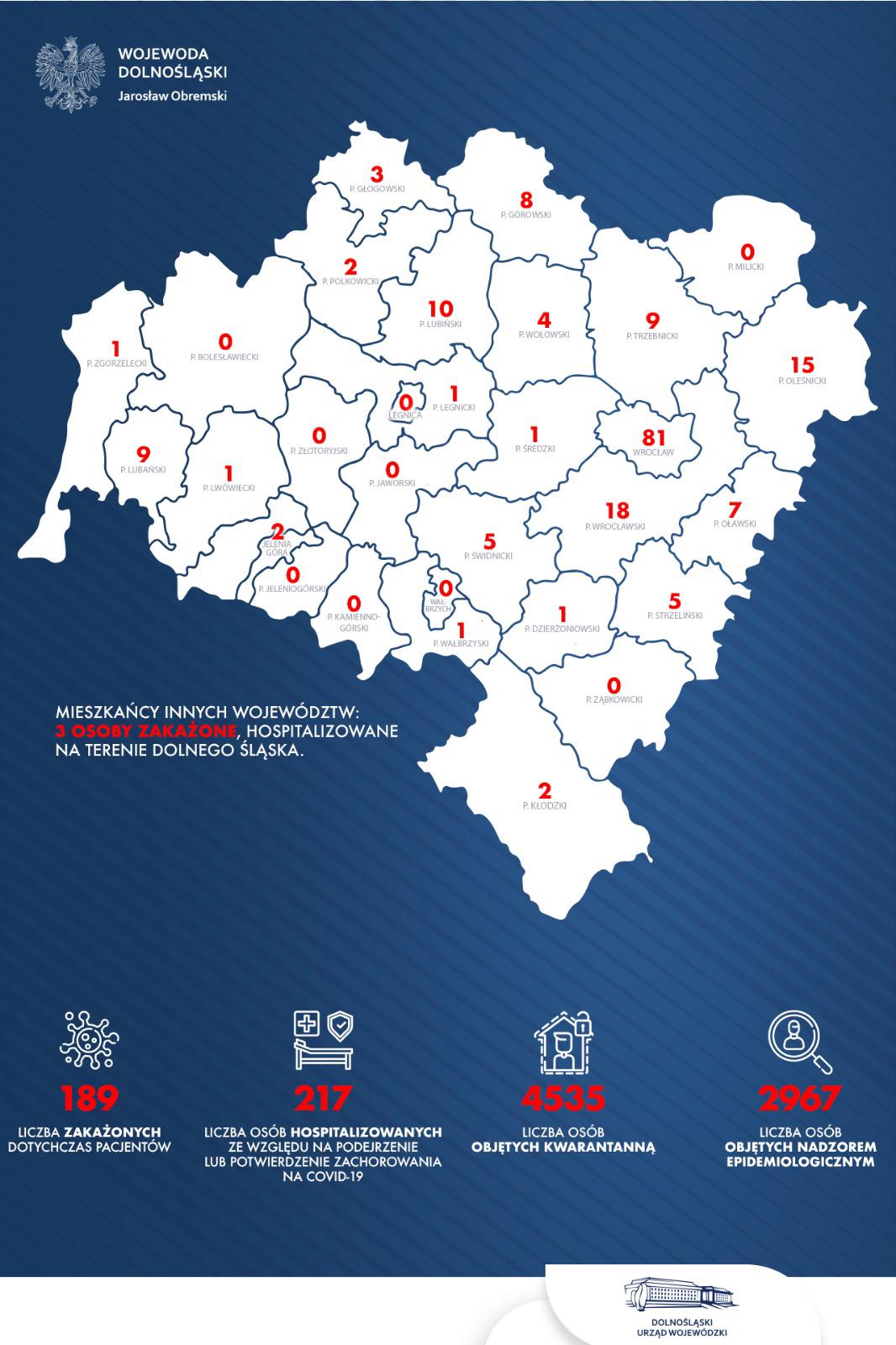 Jak informuje Dolnośląski Urząd Wojewódzki na terenie naszego województwa jest już 189 potwierdzonych przypadków zachorowania na COVID-19. W piątek potwierdzono 24 nowe przypadki zakażenia koronawirusem. Są to mieszkańcy mieszkańcy powiatu górowskiego, lubańskiego, trzebnickiego oraz Wrocławia.