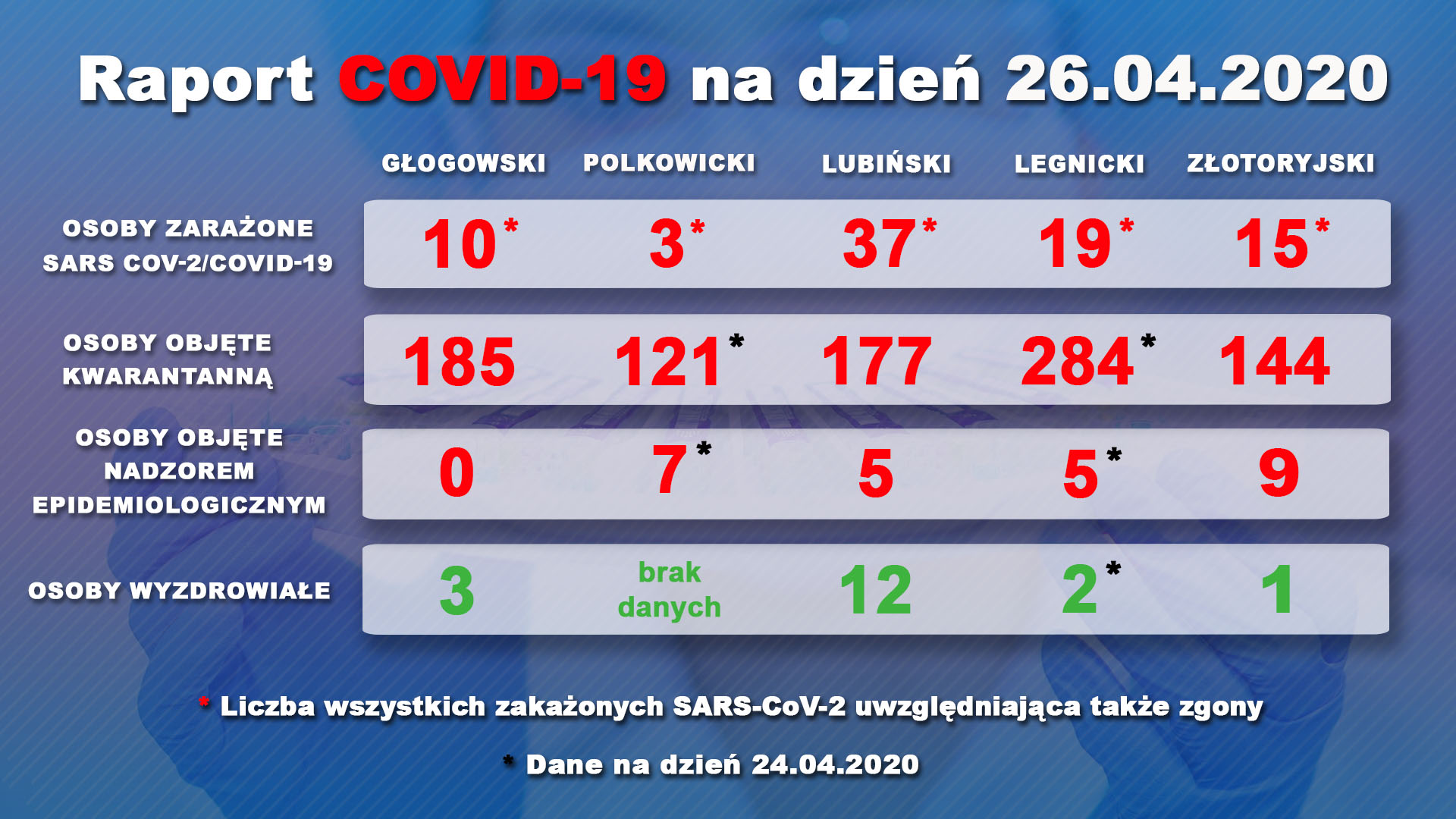 Dwa nowe przypadki odnotowano także w Legnicy. Jeśli chodzi o resztę powiatów naszego regionu nie stwierdzono większych zmian w porównaniu z sobotą.