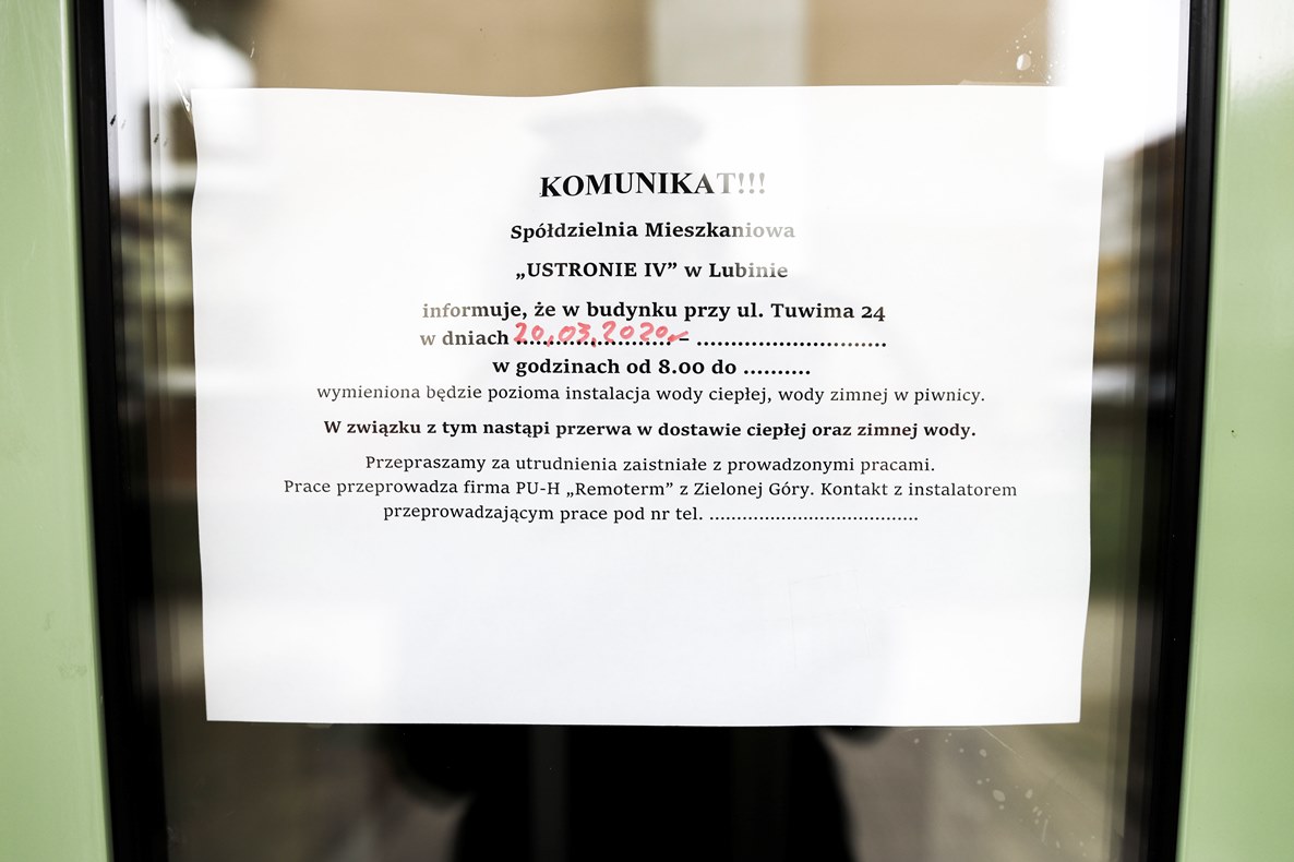 O planowanych przerwach w dostawie wody mieszkańcy zostali powiadomieni, ale, jak przyznają, kartka z informacją została wywieszona dopiero w czwartek rano, czyli tego samego dnia, gdy odcięto wodę. – Mogli ją też powiesić późnym wieczorem w środę. Myśmy tej kartki w ogóle nie widzieli. Mam wrażenie, że zrobili to celowo, żebyśmy nie zdążyli zareagować. Z kolei ta kartka, która informuje o dzisiejszych utrudnieniach, została zawieszona wprawdzie wczoraj, ale na zewnętrznych drzwiach budynku, a nie w środku na tablicy ogłoszeń. Biorąc pod uwagę to, że ktoś się stosuje do zaleceń i nie wychodzi z domu, to nie miał prawa zobaczyć tej kartki. Na razie zimna woda jest, więc i tak jest lepiej niż w tamtym tygodniu – zauważa mieszkanka ul. Tuwima.