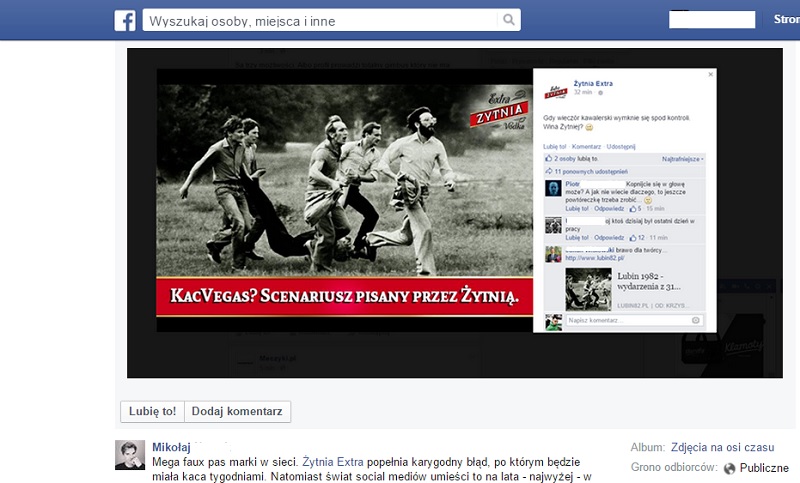Jeden z użytkowników portalu społecznościowego umieścił na swoim koncie screen z oficjalnego profilu producenta wódki z opisem „Mega faux pas marki w sieci. Żytnia Extra popełnia karygodny błąd, po którym będzie miała kaca tygodniami (…)”