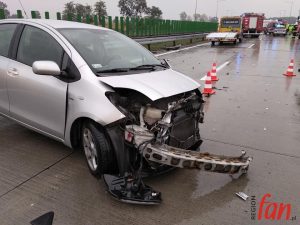 Kierująca toyotą (prawdopodobnie) obywatelka Ukrainy nieprawidłowo włączyła się na pasy autostrady zajeżdżając drogę kierującej seatem. Doszło do zderzenia, w wyniku którego obrażeń doznały obie kierujące. Obie poszkodowane zostały przewiezione do szpitala specjalistycznego w Legnicy. Sprawczynię kolizji ukarano mandatem. Przez kilkadziesiąt minut ruch w tym miejscu odbywał się jednym pasem.