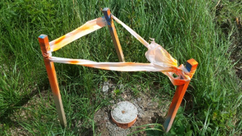 punkt_granicznyBudimex oznakował przebieg nowej ekspresówki za pomocą stalowych prętów. Wszystkie zostały zabetonowane i zabezpieczone trzema drewnianymi palikami, obwiązanymi taśmą drogową. Natomiast granice pasa drogowego wytyczono drewnianymi palikami.