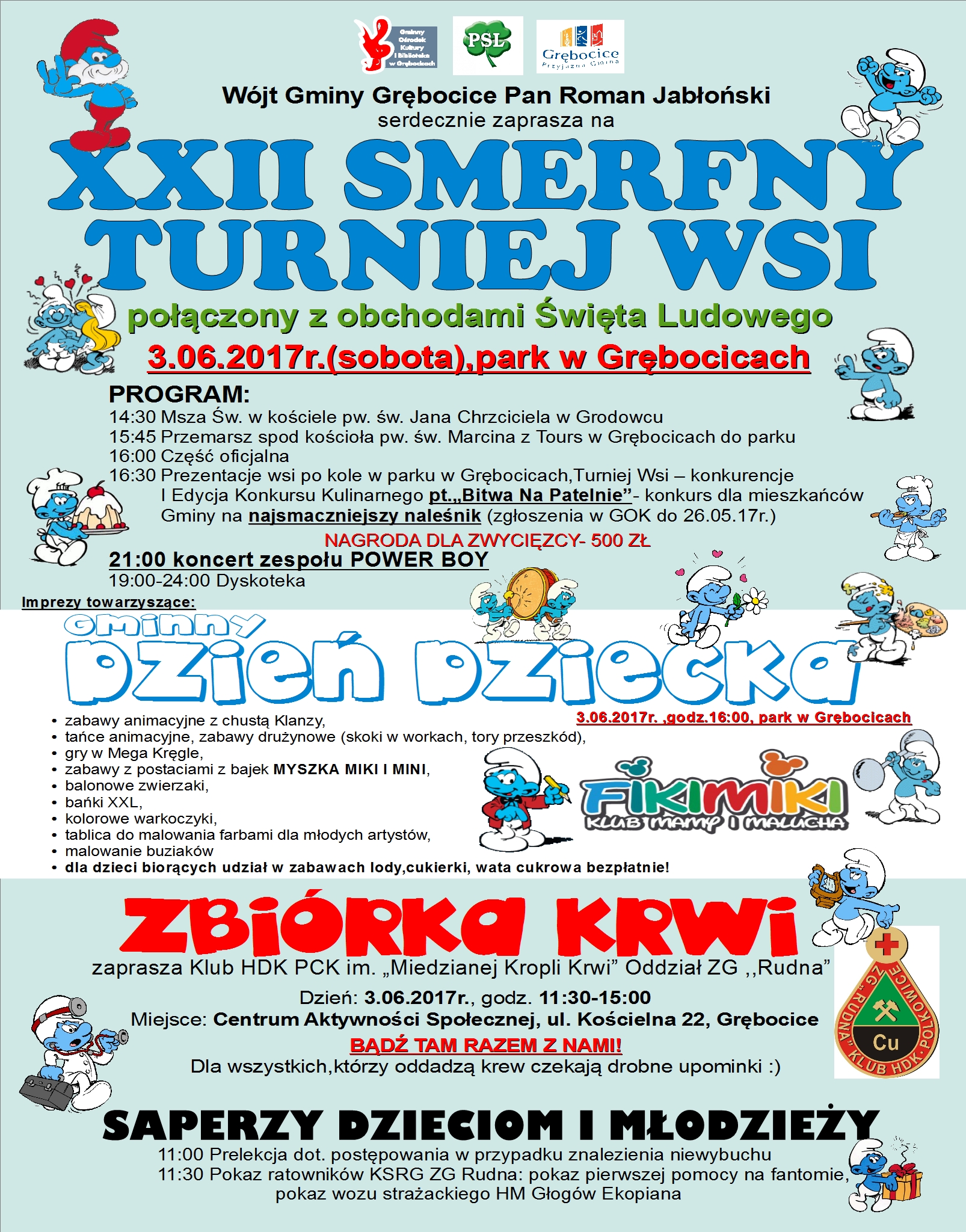 XXII Smerfny Turniej Wsi, połączony z obchodami Święta Ludowego, odbędzie się 3 czerwca w parku w Grębocicach. W tym dniu, dla najmłodszych mieszkańców, przygotowano też wiele atrakcji z okazji Dnia Dziecka. Będzie również zbiórka krwi organizowana w Centrum Aktywności Społecznej przy ul. Kościelnej 2 przez Klub HDK im. Miedzianej Kropli Krwi przy ZG Rudna, w godz. 11.30-15.