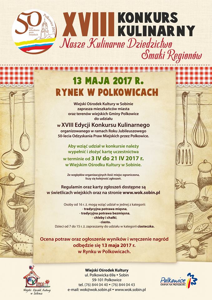 WOK_CHLEB4Cztery kategorie dla dorosłych: tradycyjne potrawy mięsne i bezmięsne, chleby i chałki oraz ciasta, a do tego kolejna: ciasteczka – dla dzieci w wieku od 7 do 15 lat. Pomysłowością i kunsztem w tej dziedzinie mogą wykazać się mieszkańcy gminy Polkowice zgłaszając się do XVIII Edycji Konkursu Kulinarnego, organizowanego przez Wiejski Ośrodek Kultury w Sobinie.
