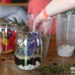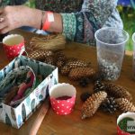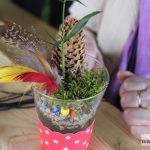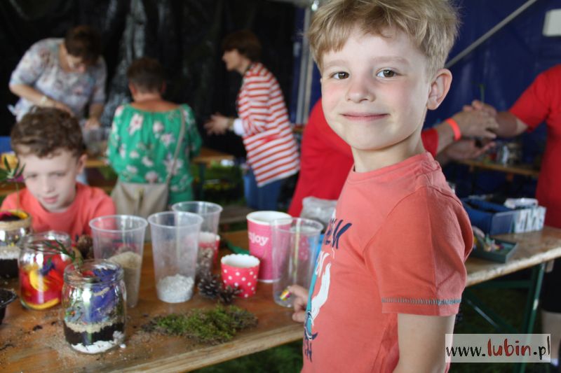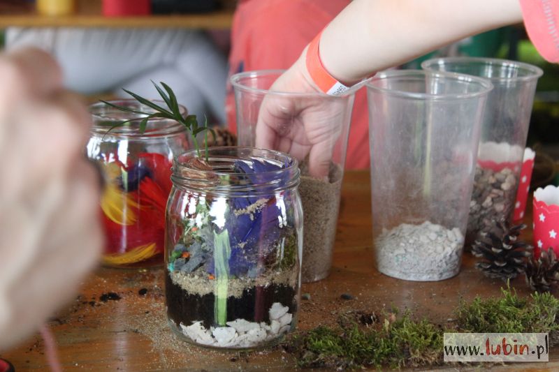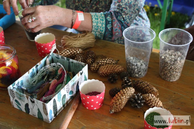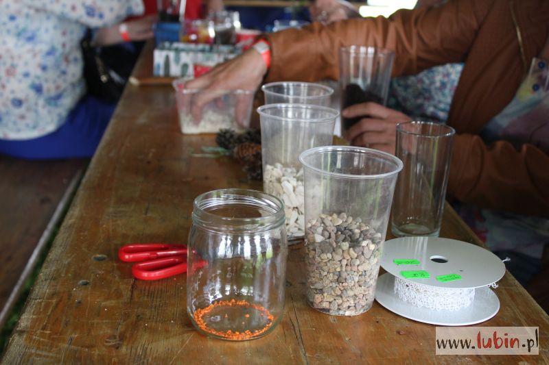 W drugim namiocie czekają na nas szklanki, kubki i słoiki. Zaraz obok kawałki kory, szyszki, ziemia, kamyki. Dalej kolorowe piórka, ozdobne wstążki, mulina i dratwa. Pomysłodawczynie projektu zachęcają lubinian do własnoręcznego przygotowania kwiatowej kompozycji w szkle.