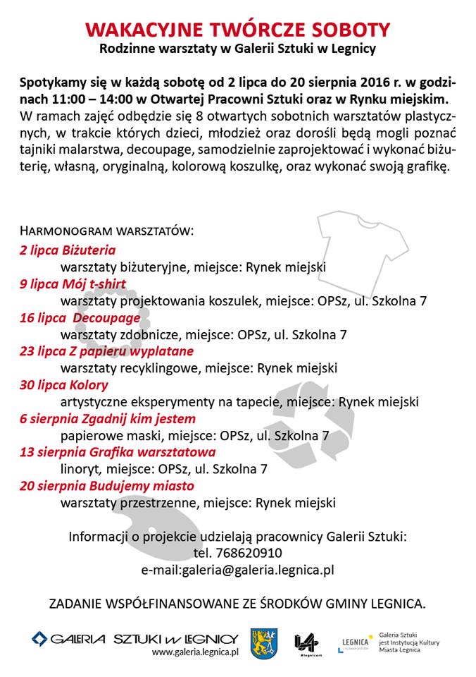 Wakacyjne twórcze sobotyWakacyjne twórcze soboty” to natomiast rodzinne warsztaty artystyczne, w trakcie których dzieci, młodzież oraz dorośli będą mogli poznać tajniki malarstwa, decoupage, samodzielnie zaprojektować i wykonać biżuterię, grafikę czy oryginalną koszulkę. Spotykania odbywać się będą w Otwartej Pracowni Sztuki oraz Rynku Miejskim.