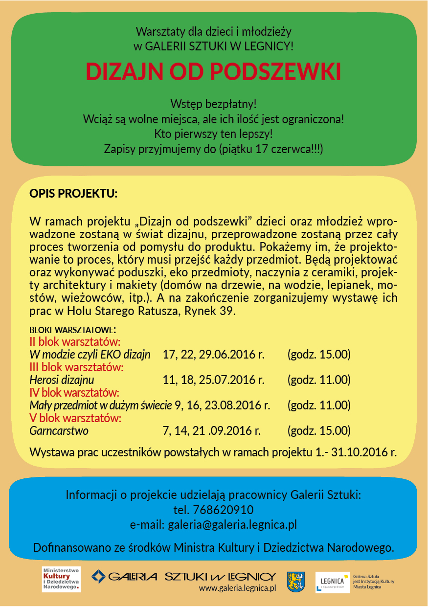 Dizajn od podszewki” to warsztaty dla dzieci i młodzieży, które wprowadzą uczestników w świat dizajnu i przeprowadzą przez cały proces tworzenia: od pomysłu do produktu. Uczestnicy będą projektować i wykonywać poduszki, eko przedmioty, naczynia z ceramiki oraz różnego rodzaju makiety. Warsztaty zwieńczy wystawa ich prac.