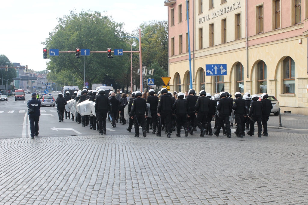 Pseudokibice, w asyście funkcjonariuszy, w spokoju przemaszerowali do parku Miejskiego. Przed stadionem doszło jednak do symulowanych zamieszek i mundurowi musieli m.in. użyć armatek wodnych. – Ćwiczenia mają na celu zgranie współpracy pomiędzy poszczególnymi pododdziałami policji oraz monitoringiem miejskim – tłumaczy podinspektor Sławomir Masojć, oficer prasowy legnickiej jednostki.