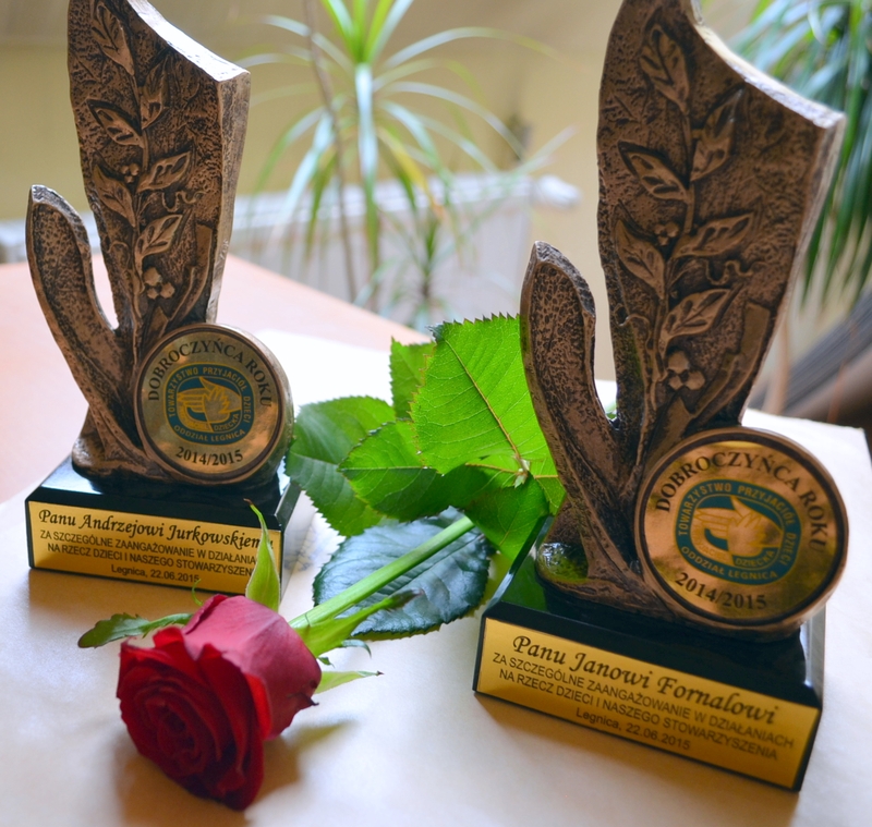 Funkcjonariusze wydziału ds. nieletnich i patologii z Komendy Miejskiej Policji w Legnicy otrzymali statuetkę „Dobroczyńca Roku 2014/2015”. Aspiranta sztabowego Jana Fornala i aspiranta Andrzeja Jurkowskiego nagrodzono za „szczególne zaangażowanie w działaniach na rzecz dzieci i stowarzyszenia”.