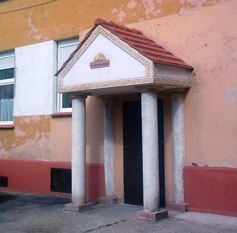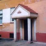 9. Tympanon na kolumnach, czyli wejście do klatki schodowej bloku przy ul. Chojnowskiej (od podwórza przy ul. Korczaka)
