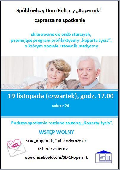 Legnicka Spółdzielnia Mieszkaniowa, jako pierwsza w mieście, wyszła z inicjatywą promocji tzw. koperty życia, czyli zestawu informującego o stanie zdrowia seniorów. Jutro, 19 listopada, o godz. 17 w SDK Kopernik odbędzie się spotkanie informacyjne, połączone z pogadanką na temat przydatności koperty życia.