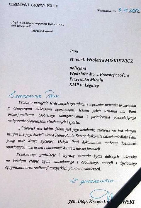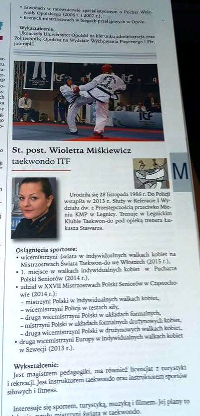 W gronie nagrodzonych znalazła się również starszy posterunkowy Wioletta Miśkiewicz, na co dzień policjantka w Komendy Miejskiej Policji w Legnicy, zawodniczka Legnickiego Klubu Taekwon-do i reprezentantka Polski w Taekwon-do. Legniczanka w maju tego roku sięgnęła po dwa tytuły Indywidualnej Wicemistrzyni Świata w walkach pow. 75 kg i testach siły podczas XIX Mistrzostw Świata w Taekwon-do we włoskim Jesolo.