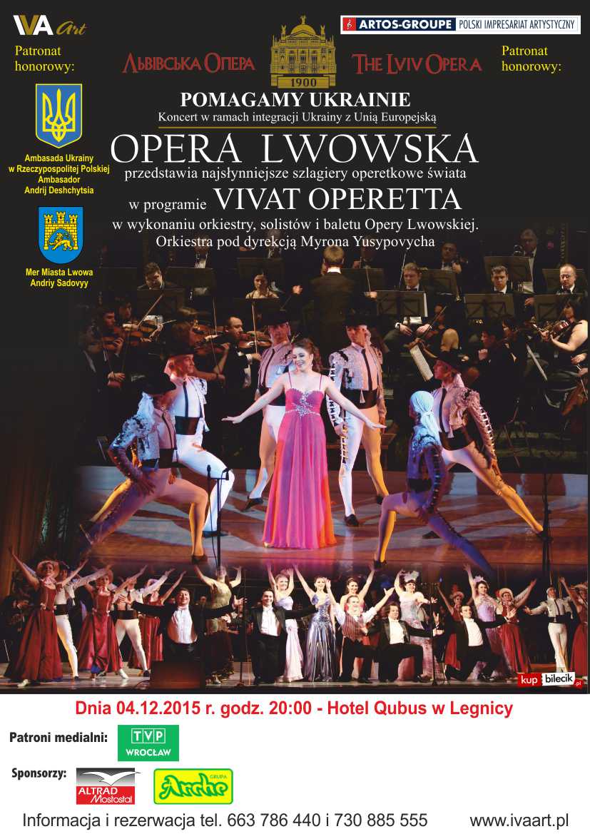 plakat Lwów„Vivat Operetta” – to koncert, z jakim w legnickim hotelu Qubus wystąpi 4 grudnia o godzinie 20 Opera Lwowska. Wydarzenie organizowane jest w ramach pomocy dla Ukrainy i jej integracji z Unią Europejską. Najsłynniejsze szlagiery operetkowe świata widzowie zobaczą w wykonaniu artystów baletu i solistów Opery Lwowskiej. Zagra orkiestra pod dyrekcją Myrona Yusypovycha.
