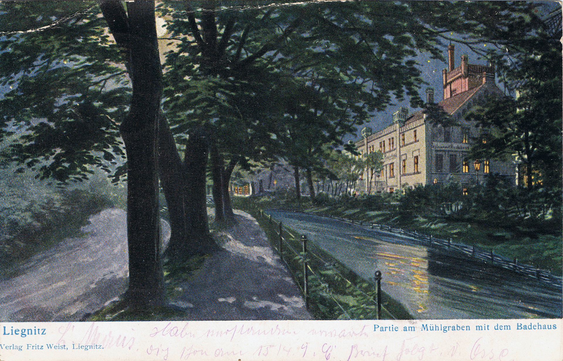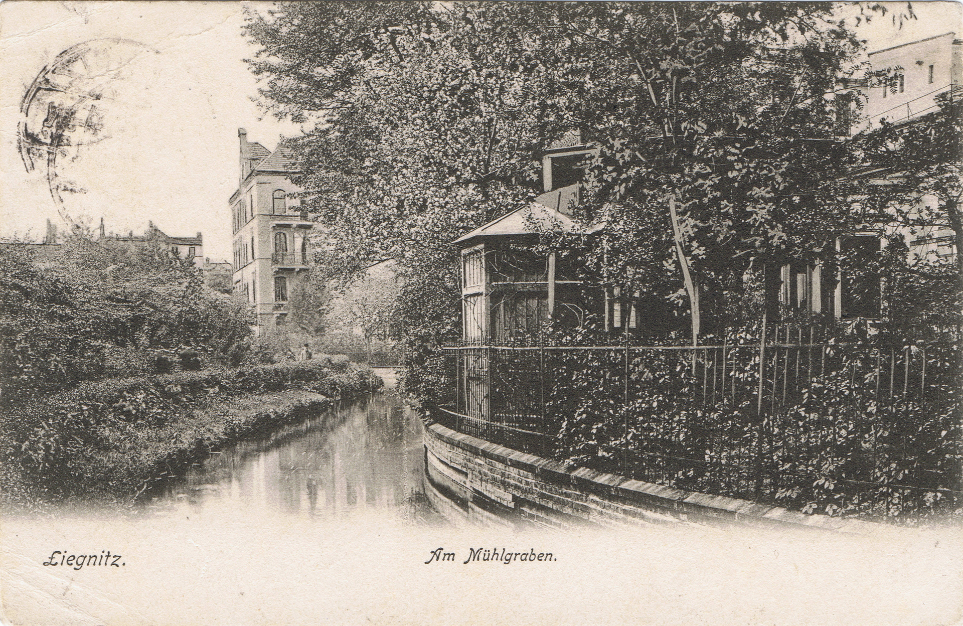 Obronność legnickiego grodu warownego świetnie wzmacniały warunki naturalne: od zachodu mokradła, od północy i wschodu nieistniejące odnogi Czarnej Wody i Młynówka. Na początku XV w. powstał miejski wodociąg, doprowadzający wodę za pomocą rur z Młynówki do zbiornika w północnej części Rynku. Nad samą rzeką natomiast od 1430 r. wznosiła się murowana wieża ciśnień, wyglądem przypominająca warowną wieżę. Woda napędzała koła pięciu legnickich młynów, a w razie powodzi kanał odprowadzał jej nadmiar.LM 0109 A