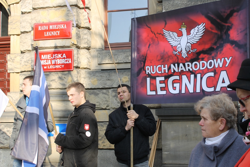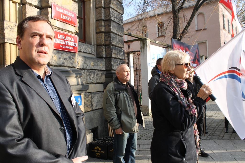 IMG_1656Około czterdziestu działaczy Ruchu Narodowego, na czele z Arturem Borodaczem, oraz Kongresu Nowej Prawicy i Klubu „Gazety Polskiej” pikietowało dziś pod siedzibą miejskiej komisji wyborczej, która mieści się w Urzędzie Miasta Legnicy. Domagają się unieważnienia i powtórzenia wyborów samorządowych.