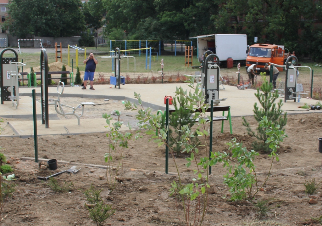 Siłownia powstaje w sąsiedztwie zbudowanego kilka lat temu placu zabaw. Ustawione zostały urządzenia do ćwiczeń. Posadzono drzewka i inne rośliny, ustawiono też ławki i kosze.