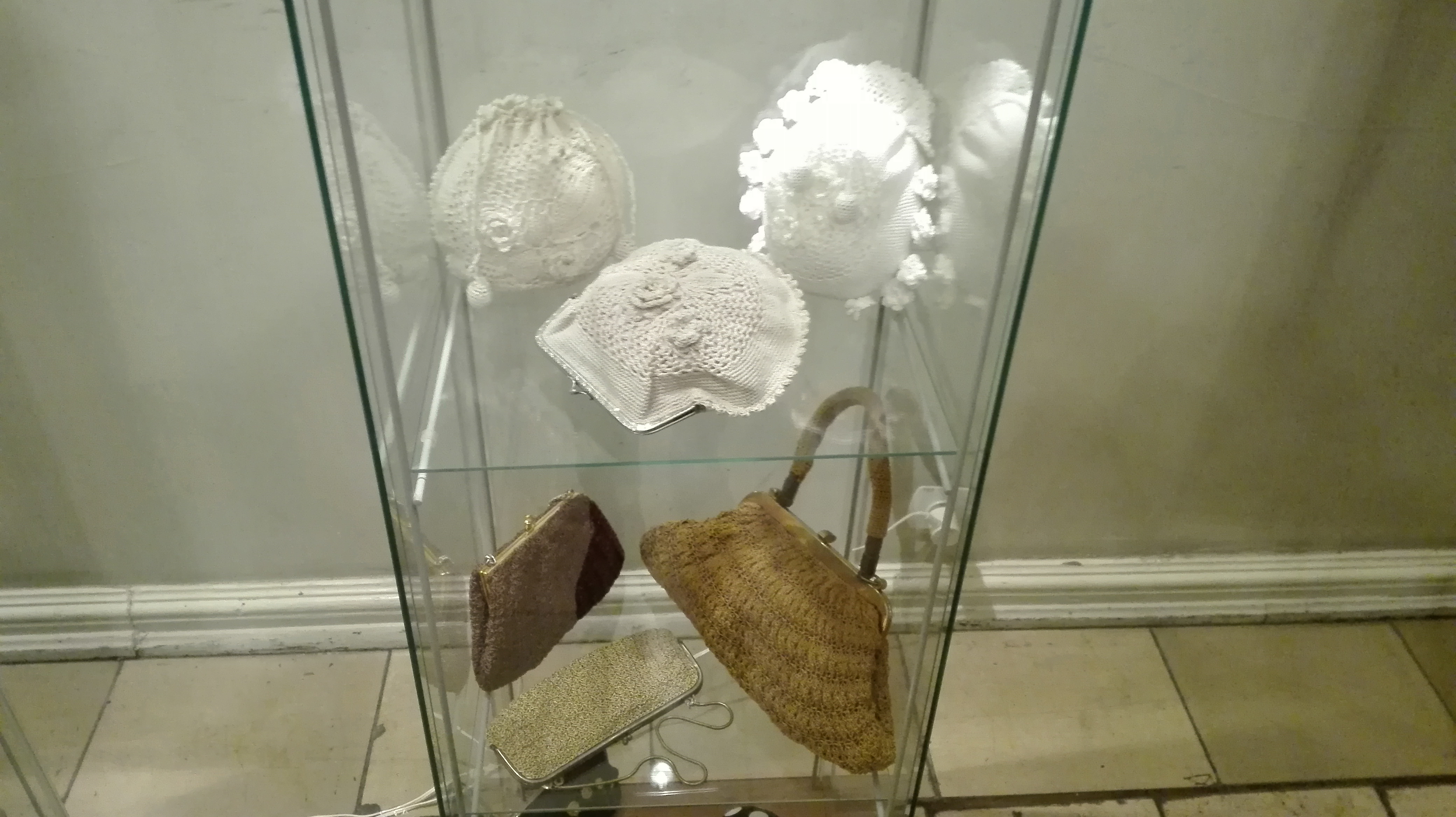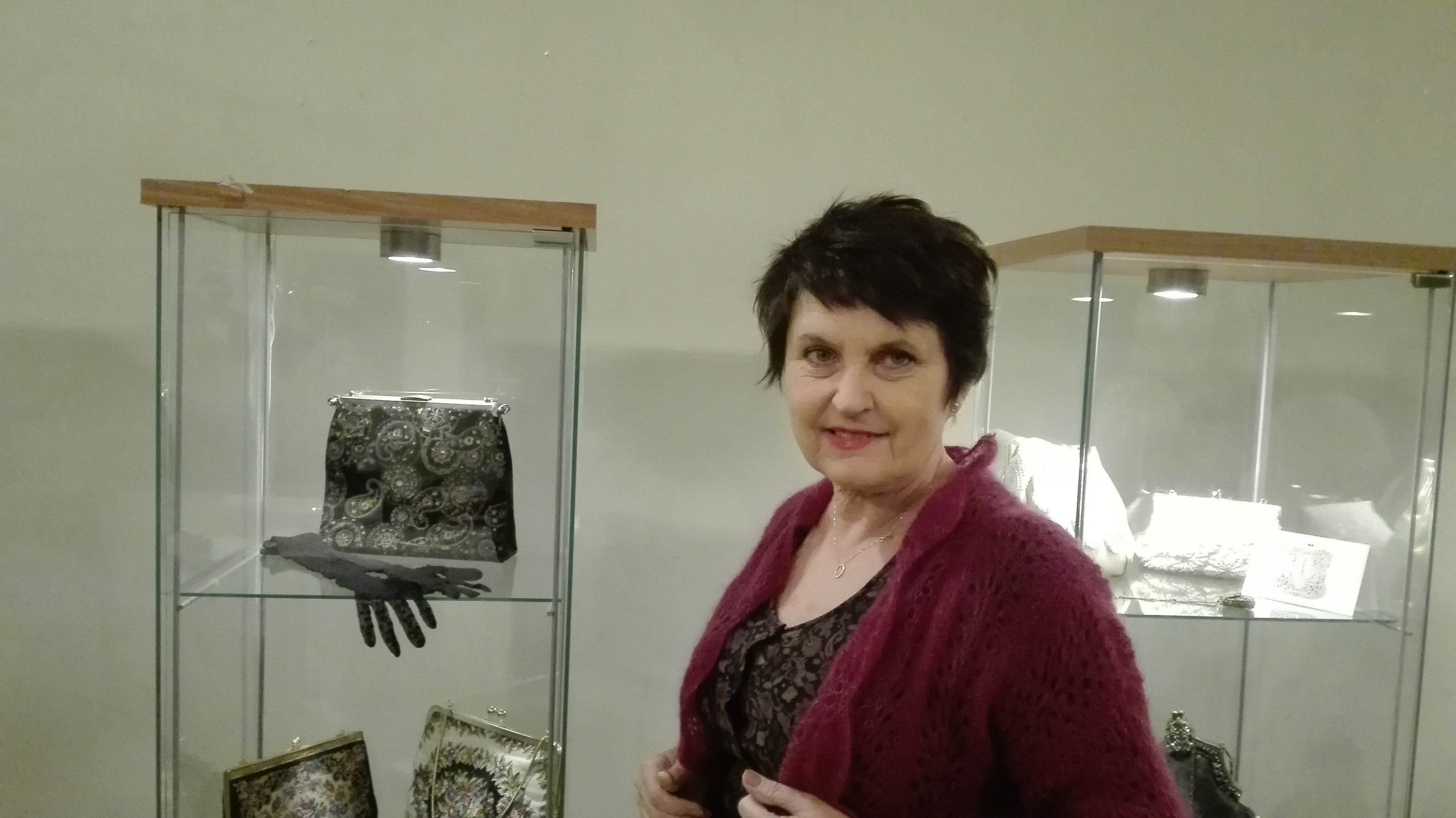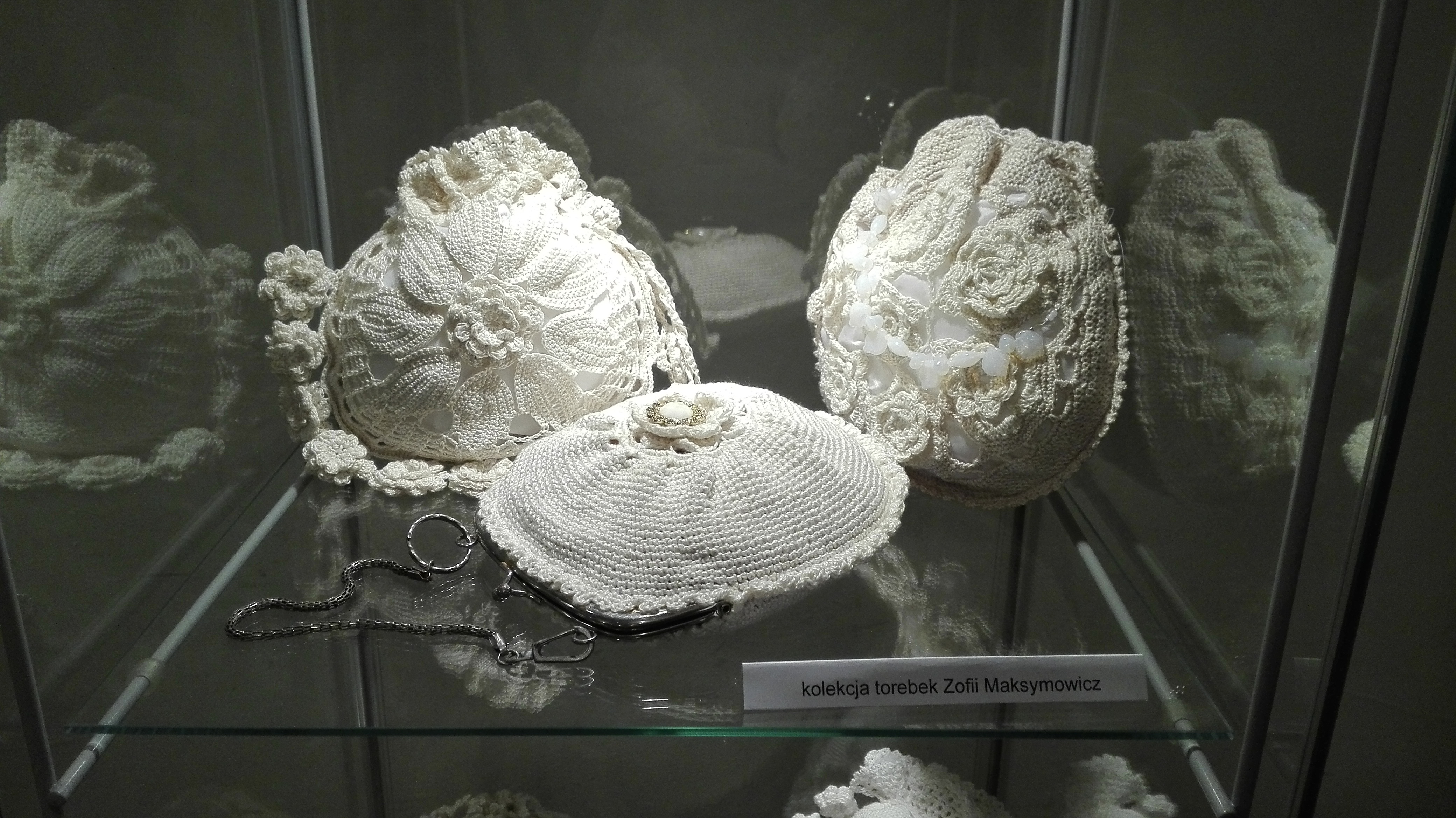 Jedna z gablot wypełniona jest torebkami zrobionymi własnoręcznie przez kolekcjonerkę.