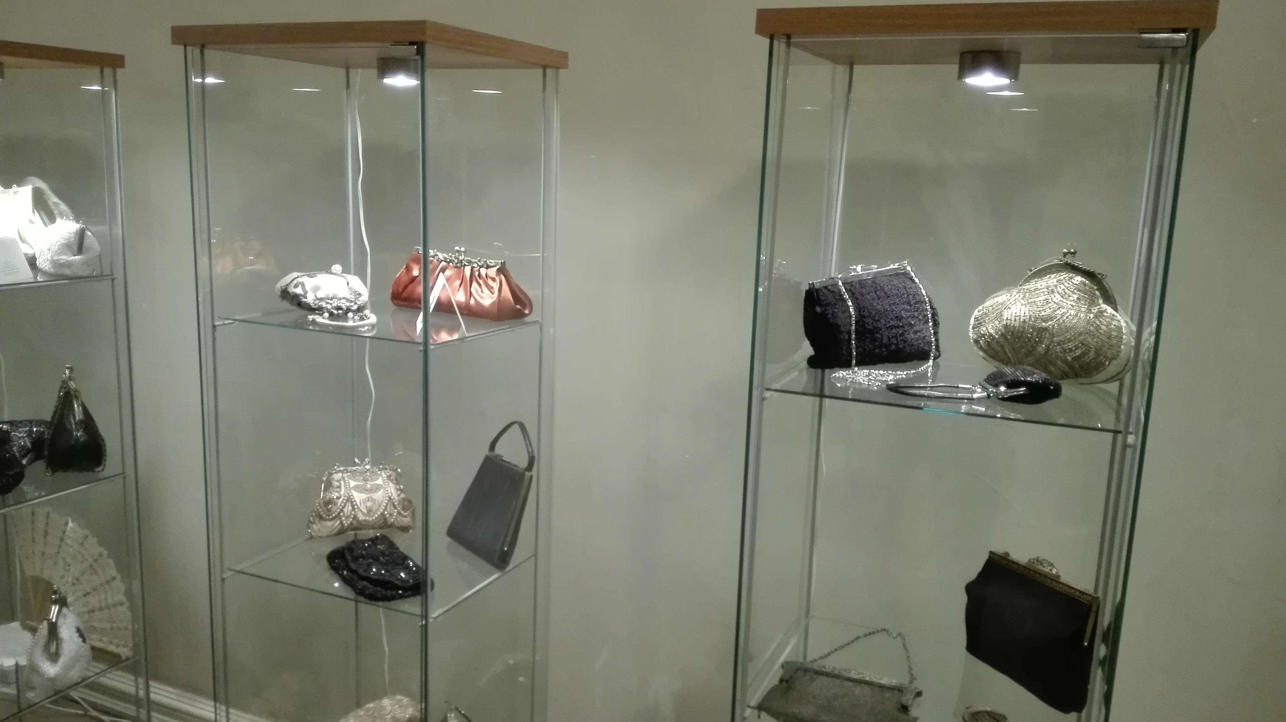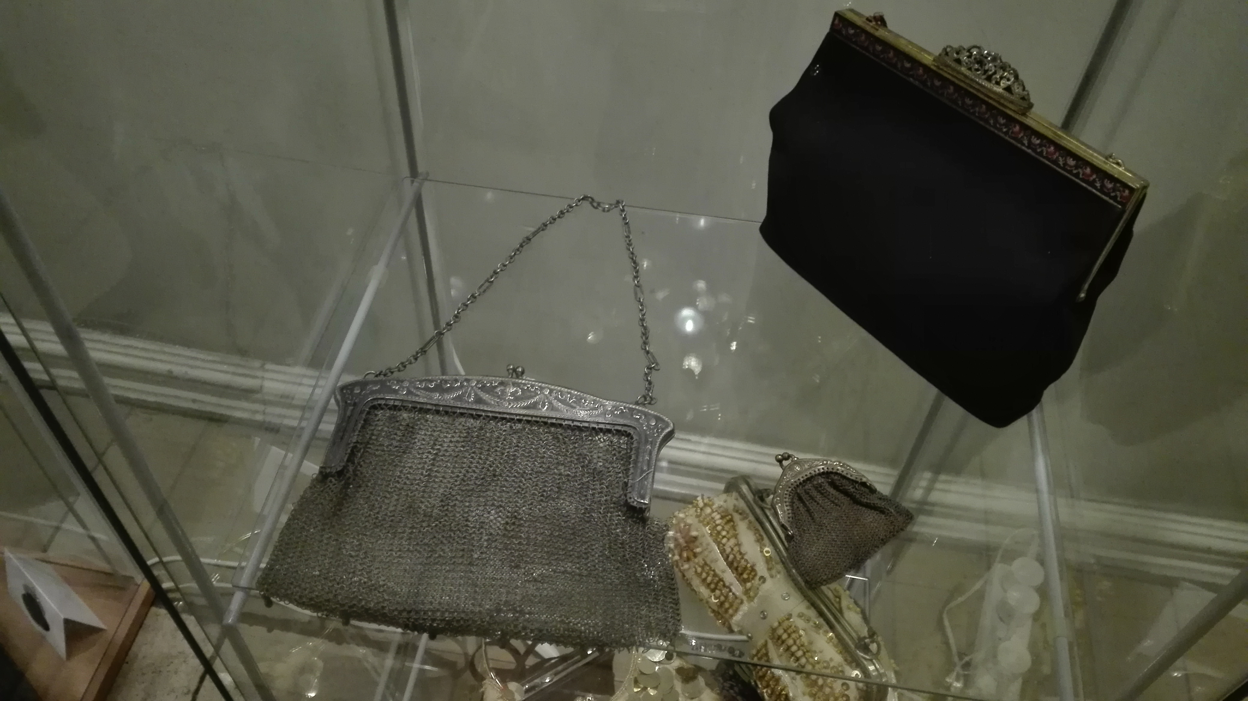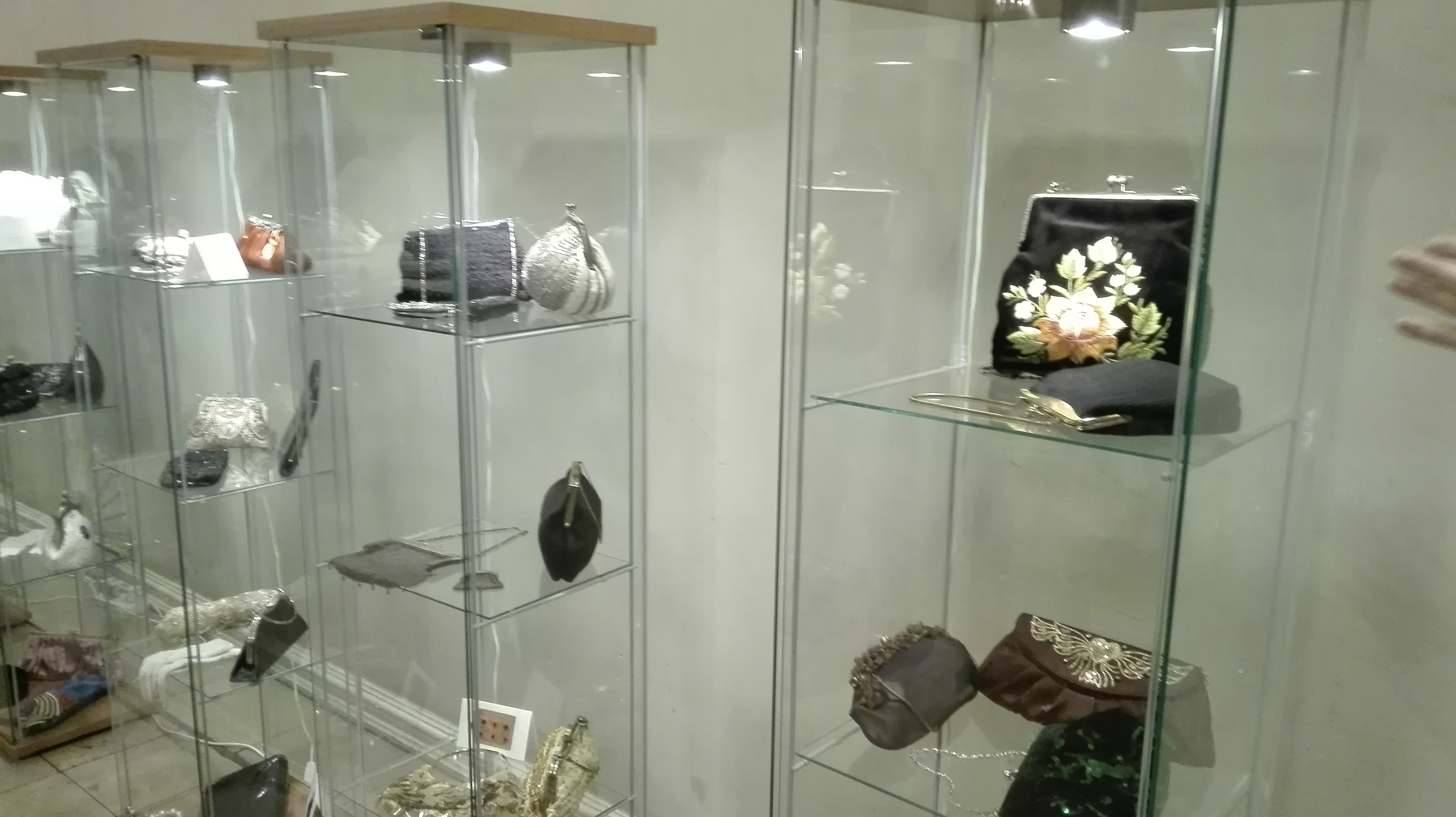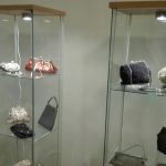 Jedna z gablot wypełniona jest torebkami zrobionymi własnoręcznie przez kolekcjonerkę.