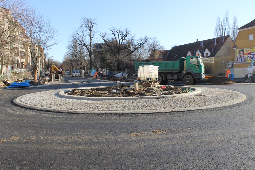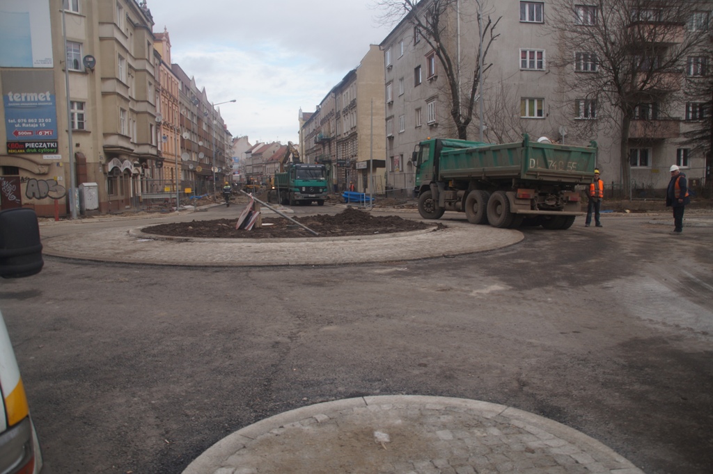 W rejonie ronda zbudowano już część chodników, a pod blokiem należącym do Legnickiej Spółdzielni Mieszkaniowej powstaje podjazd dla osób niepełnosprawnych. Ekipy budowlane koncentrują się też na kamiennej podbudowie konstrukcji jezdni między ulicami Andersa a Oświęcimską.