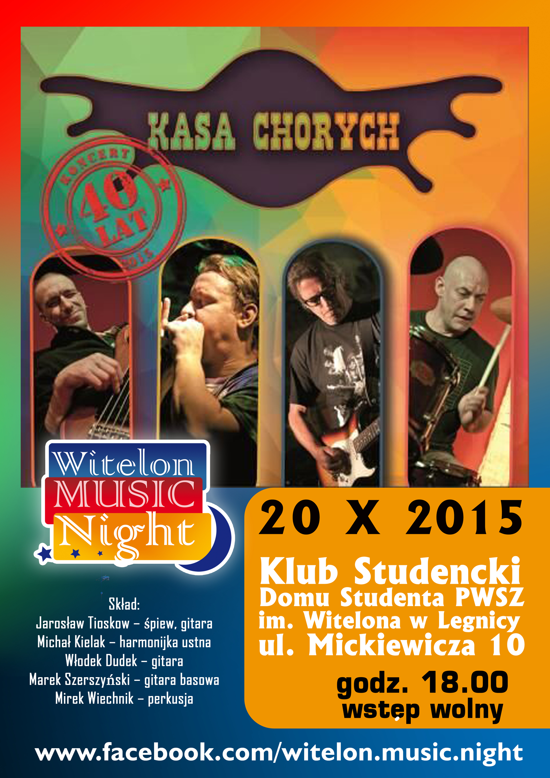 Państwowa Wyższa Szkoła Zawodowa im. Witelona w Legnicy oraz zespół Kasa Chorych zapraszają na jubileuszowy koncert z okazji czterdziestolecia działalności grupy. Impreza odbędzie się 20 października (wtorek) o godzinie 18 do Domu Studenta przy ul. Mickiewicza 10.
