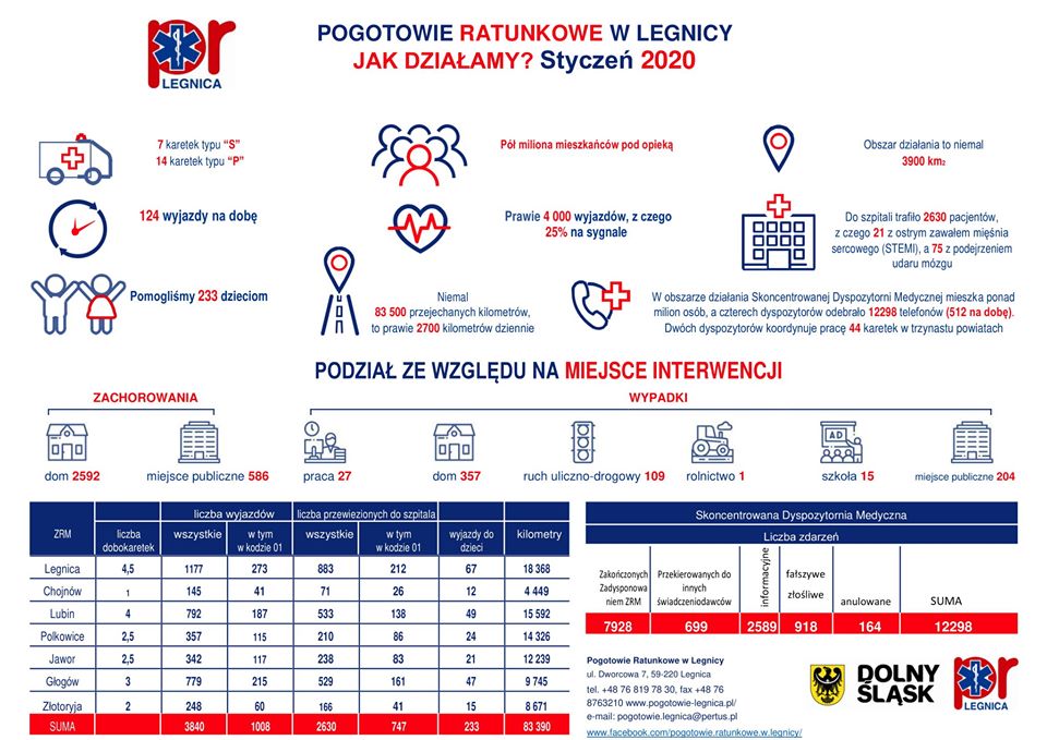 Jakie liczby znajdziemy w podsumowaniu legnickiego pogotowia? Przeglądając grafikę można dowiedzieć się przede wszystkim, np. że tabor ratowników to 7 karetek typu „S” oraz 14 karetek typu „P”. W styczniu pracownicy, którzy dbają o zdrowie w sumie pół mln mieszkańców (obszar działania: blisko 3,9 tys. m.kw.) wyjeżdżali do wezwań 124 razy na dobę (prawie 4 tys. w styczniu, z czego ćwierć stanowią wyjazdy na sygnale). Pomogli w tym czasie 233 dzieciom, przejeżdżając 83,5 tys. kilometrów.