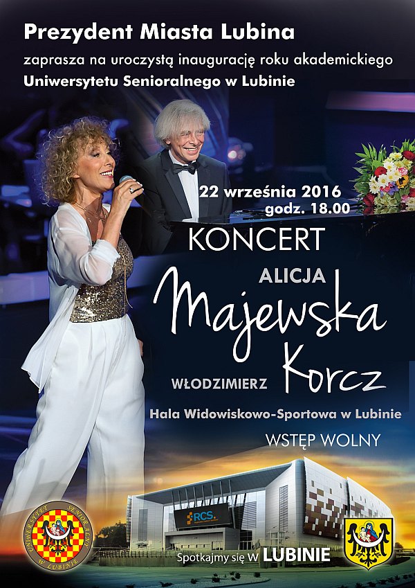 Już po raz trzeci lubińscy seniorzy zainaugurują nowy rok akademicki koncertem w hali widowiskowo-sportowej. Tym razem wystąpią tu Alicja Majewska oraz Włodzimierz Korcz. – Hala jest tak duża, że pomieści wszystkich chętnych. Wstęp jest bezpłatny, więc zapraszamy wszystkich lubinian, nie tylko seniorów – mówi Jacek Mamiński, rzecznik prezydenta Lubina.