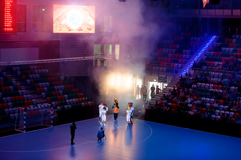 Pierwszą bramkę w nowym sezonie dla miedziowych zdobył Wojciech Gumiński. Chwilę później odpowiedział Patryk Walczak. Trzy kolejne bramki dołożyli Michał Stankiewicz, Nikola Dzono i Mikołaj Szymyślik, a w międzyczasie trzy groźne rzuty przyjezdnych obronił Jurii Shamrylo. W 7. minucie na tablicy wyników było 4:1 i można powiedzieć wymarzony początek ekipy, prowadzonej przez Pawła Nocha i Adriana Anuszewskiego. Lubinianie grali znakomicie w obronie, a w bramce fenomenalnie spisywał się ukraiński golkiper. Już w 12.minucie o czas poprosił szkoleniowiec Pogoni, Rafał Biały. Jego drużyna miała na swoim koncie zaledwie jedną bramkę. Drugie trafienie portowców miało miejsce w 15.minucie, kiedy Shamrylę pokonał Dawid Krysiak. W kolejnych pięciu minutach gospodarzom zdarzył się przestój i szczecinianie zniwelowali straty do trzech bramek. O czas poprosił Paweł Noch i po chwili Zagłębie znów odskoczyło. Po bramce Łukasza Kużdeby mieliśmy 11:5. Chwilę później miedziowi wykorzystali grę w przewadze i było 12:5! Ostatnią bramkę w pierwszej części zdobył Michał Stankiewicz.