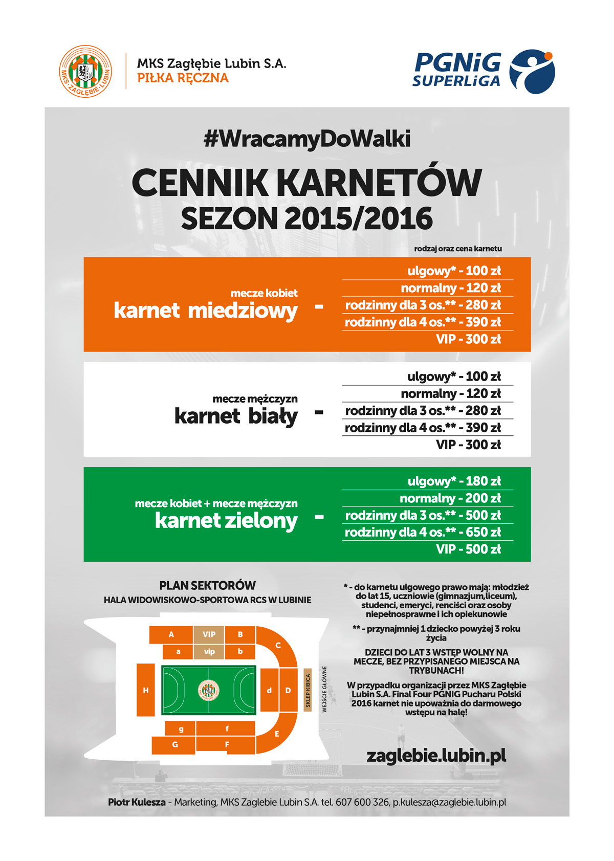 *-w przypadku organizacji Final Four PGNiG Pucharu Polski przez MKS Zagłębie Lubin S.A. karnety nie uprawniają do wstępu na halę! Karnet nie obowiązuje w europejskich pucharach kobiet.