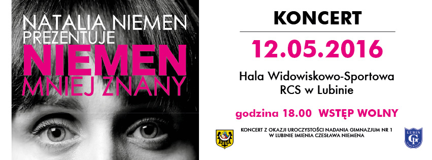 Miasto szykuje się wielkiego wydarzenia, którym będzie bezpłatny koncert Natalii Niemen z okazji uroczystości nadania Gimnazjum nr 1 w Lubinie imienia Czesława Niemena. Koncert odbędzie się w czwartek, 12 maja 2016, o godz. 18 w hali Regionalnego Centrum Sportowego.