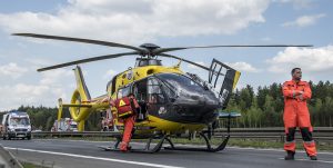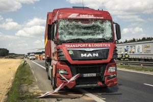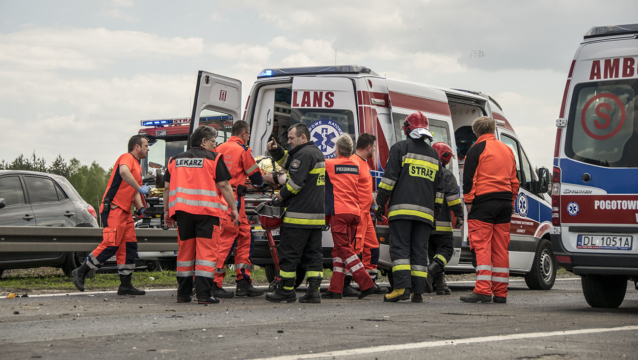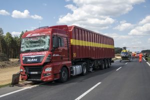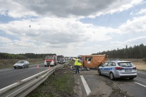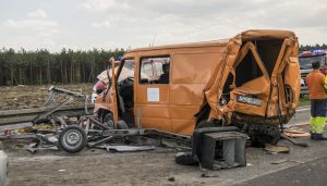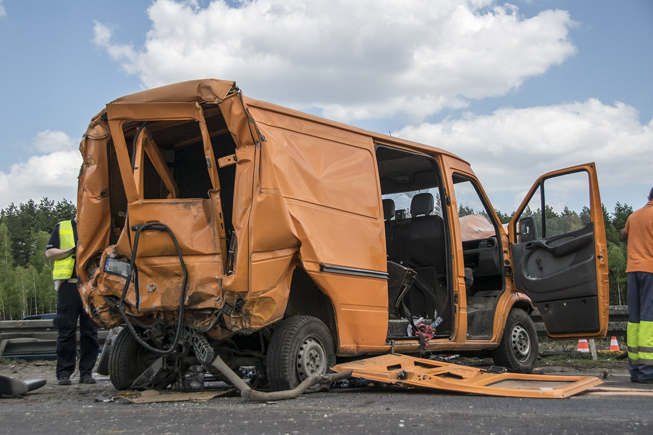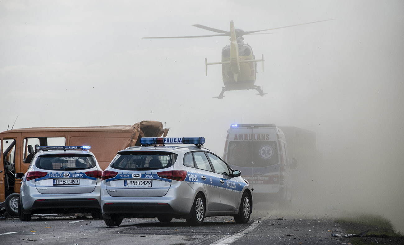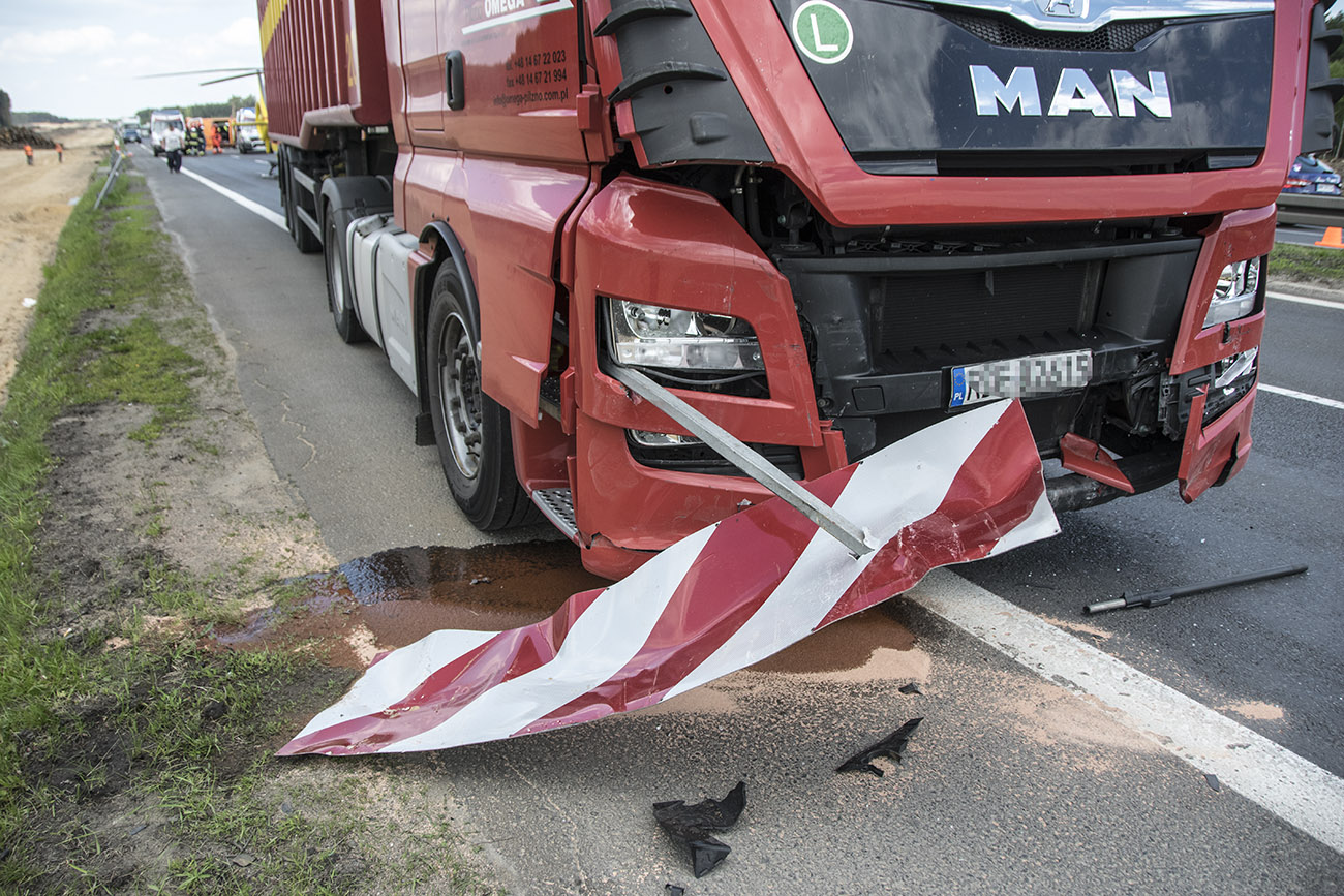 Z nieustalonych przyczyn TIR wjechał w stojącego busa należącego do Przedsiębiorstwa Budownictwa Drogowego w Głogowie. Firma prowadzi prace przy budowanej S3. W aucie siedział mężczyzna, który z poważnymi obrażeniami głowy został przetransportowany do szpitala śmigłowcem Lotniczego Pogotowia Ratunkowego.