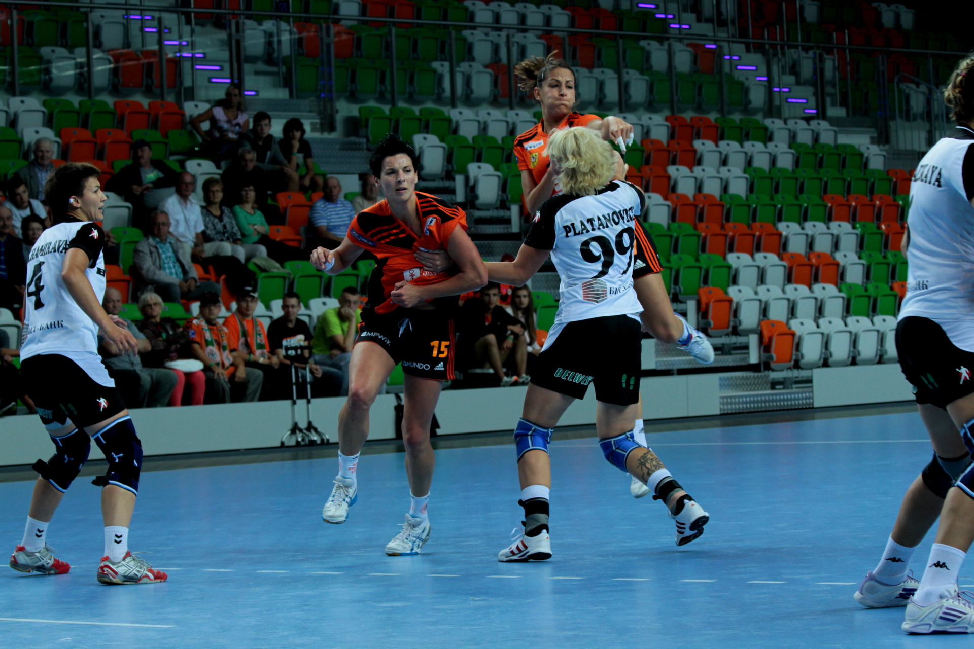 Po pięciu minutach lubinianki prowadziły 4:1, a pięć minut później 8:4. Połowę bramek zdobytych przez miedziowe rzuciła Joanna Obrusiewicz, który kolejny raz zagrała dobre spotkanie. Rywalki doprowadziły jednak do remisu – w 15. minucie spotkania było 8:8. Chwilę później karnego wykorzystała Liabov Arishina i BNTU wyszło na prowadzenie. W 18. minucie spotkania groźnie na parkiet upadła Paulian Piechnik, która została zniesiona z placu gry przez służby porządkowe. Na dwie minuty przed końcem pierwszej połowy Mińsk wygrywał 13:11, a do przerwy było 14:13.