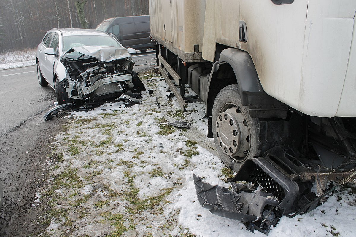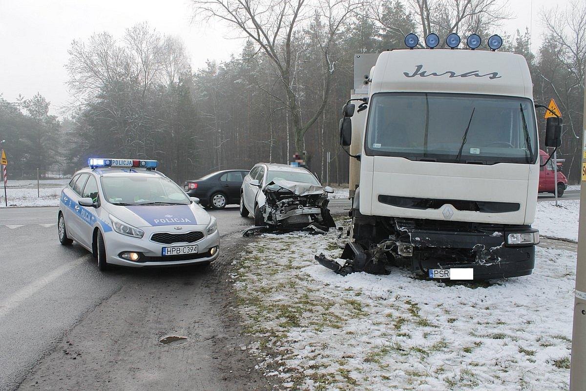 Samochód ciężarowy, próbując uniknąć zderzenia z inną ciężarówką, wjechał w osobowego opla. Kobieta, która kierowała osobówką, została zabrana do szpitala.