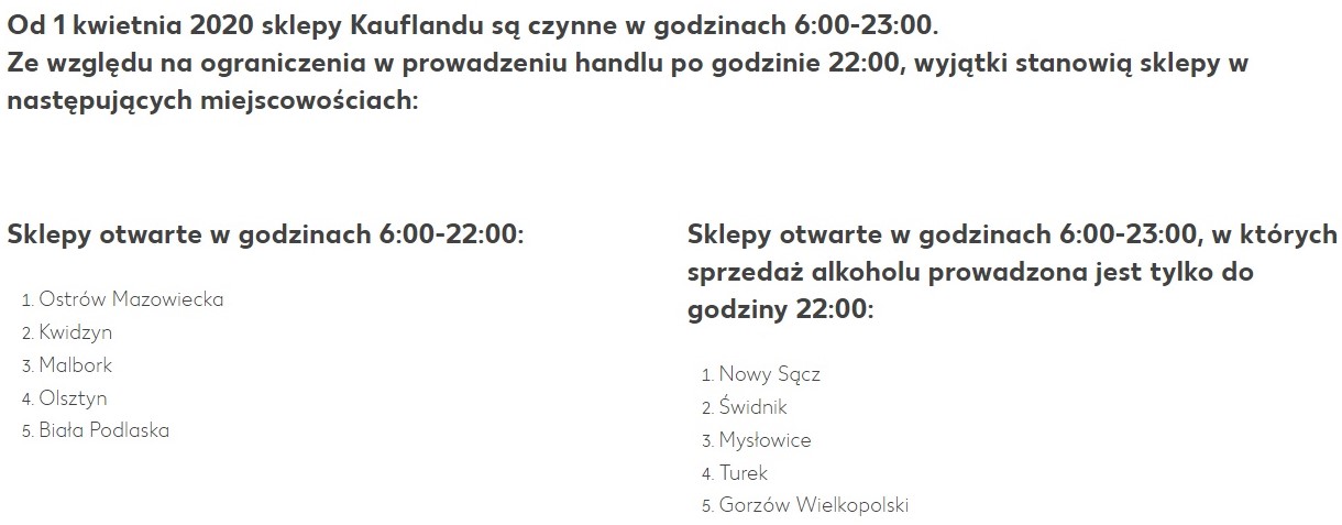 Z kolei Lidl Polska podał, że od dziś większość jego sklepów będzie czynna w godzinach 6-24. Ponadto w ramach dodatkowych udogodnień część marketów (np. w Warszawie, Krakowie, Łodzi, Wrocławiu, Gdańsku, Gdyni czy Poznaniu) będzie funkcjonować całodobowo. Szczegółowe informacje na temat godzin otwarcia pojawią się na stronie Lidl.pl oraz w aplikacji Lidl Plus.
