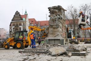 Pracownicy Legnickiego Przedsiębiorstwa Gospodarki Komunalnej, zgodnie z terminarzem, rozebrali cokół pomnika Wdzięczności dla Armii Radzieckiej. Sam monument odjechał z placu Słowiańskiego w minioną sobotę.