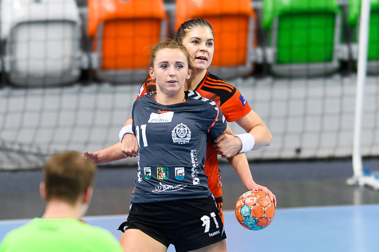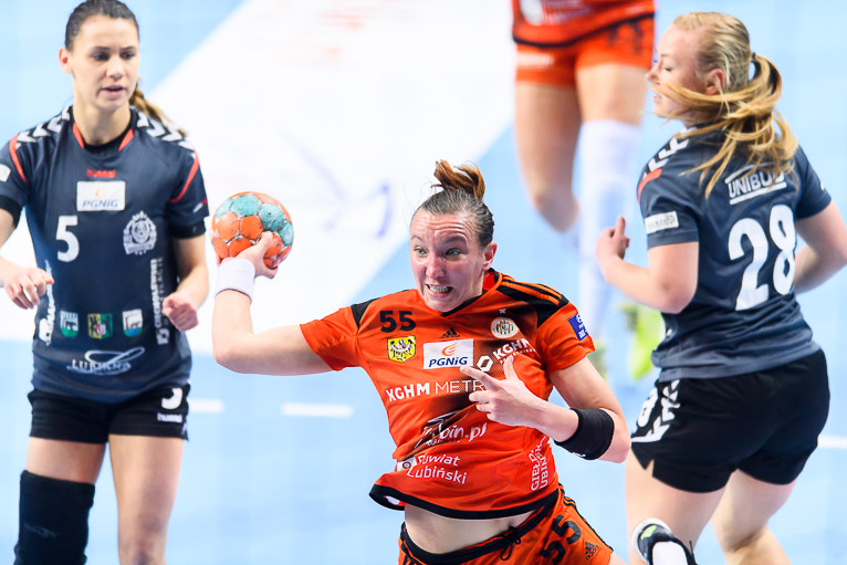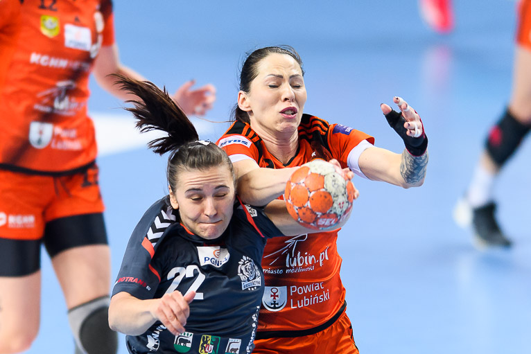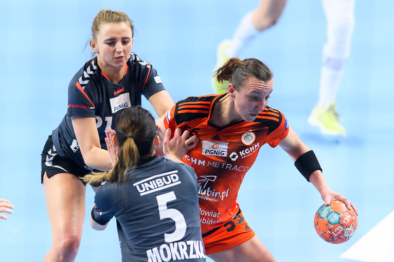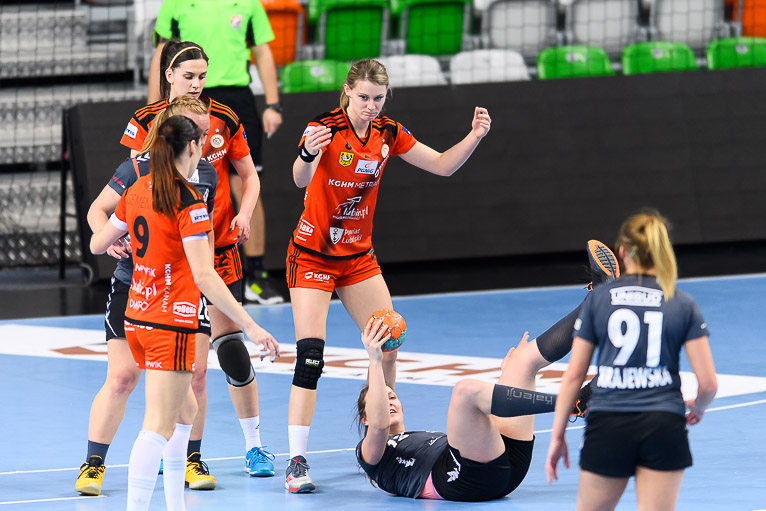 Przyjezdne prowadziły tylko raz – 1:0 w drugie minucie, po trafieniu Malwiny Hartman. Miedziowe szybko wyszły na prowadzenie, wygrywając 4:2. Kolejne fragmenty meczu to wyrównana walka bramka za bramkę. Lubinianki swoją przewagę zaczęły budować swoją przewagę w drugim kwadransie pierwszej części spotkania. Szczelna obrona i skuteczna gra w ofensywie sprawiły, że miedziowe sukcesywnie powiększały swoje prowadzenie. Z wyniku 7:6 Metraco Zagłębie Lubin wyszło na 15:7. Do przerwy lubinianki prowadziły wyraźnie – 17:9.