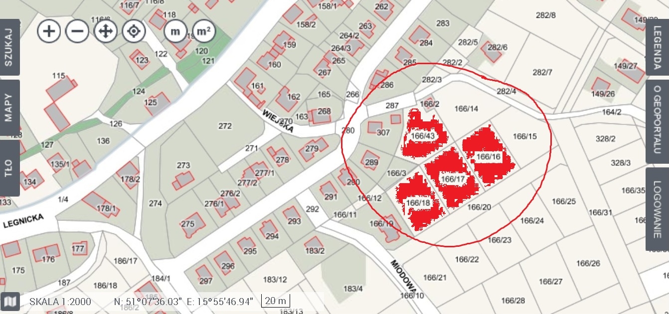Cztery z przeznaczonych na sprzedaż działek budowlanych znajdują się pomiędzy ulicami Wiejską i Miodową (boczne ul. Bohaterów Monte Cassino). To nieruchomości o numerach 166/16, 166/17, 166/18 i 166/43. Położone są w odległości ok. 1 km od ścisłego centrum miasta, w sąsiedztwie działek zabudowanych już domami jednorodzinnymi i jeszcze niezabudowanych. Można do nich dojechać wytyczoną geodezyjnie nieutwardzoną drogą gruntową.
