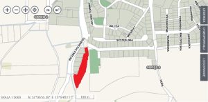 Złotoryjski magistrat wystawił także na sprzedaż dużą działkę nr 337/6 przy ul. Wojska Polskiego, rozciągającą się pomiędzy boiskiem przy ul. Lubelskiej a ostatnimi budynkami mieszkalnymi przy wylocie na Jelenią Górę (zaznaczona na czerwono na mapce poniżej). Do ścisłego centrum Złotoryi jest stąd ok. 800 m. Nieruchomość jest przeznaczona pod zabudowę mieszkaniową jednorodzinną. Ratusz żąda za nią 816 tys. zł.