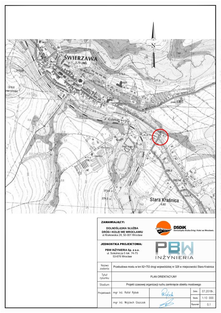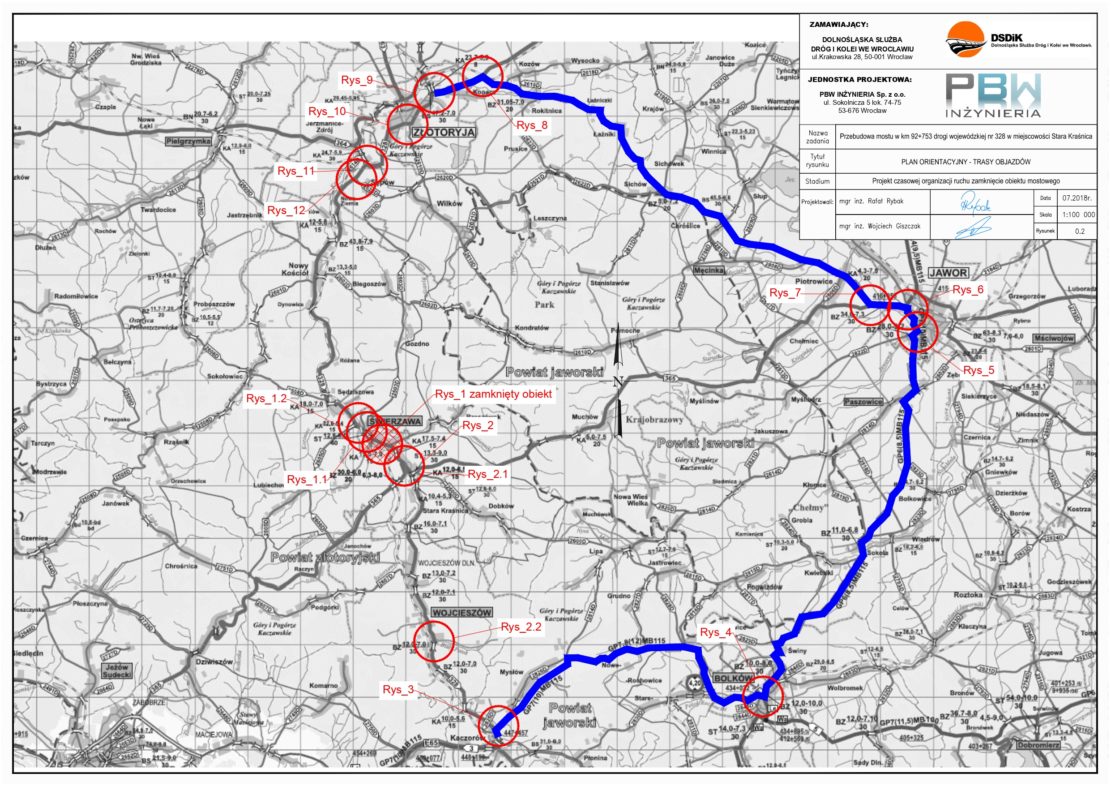 Wprowadzone zostanie całkowite zamknięcie drogi, przejazd na odcinku Złotoryja – Kaczorów poprowadzony będzie objazdem. Utrudnienia związane są z realizacją zadania pn.: “Przebudowa mostu w km 92+753 drogi wojewódzkiej nr 328 w miejscowości Stara Kraśnica wraz z budową chodnika do miejscowości Świerzawa”.