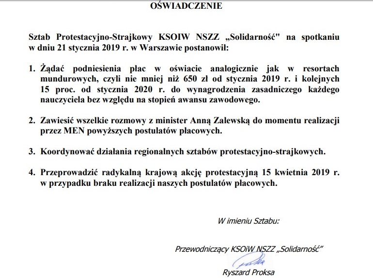 Zgodnie z wcześniejszymi przewidywaniami, dzisiejsze rozmowy z MEN-em nie przyniosły kompromisu. Obie strony wciąż mocno tkwią przy swoich stanowiskach i coraz mniej prawdopodobne wydaje się, że mogłoby do porozumienia w kwestii wynagrodzeń nauczycieli. Coraz bardzie realny staje się natomiast scenariusz zakładający ogólnopolski strajk tej grupy zawodowej, która już od dłuższego czasu upomina się o podwyżki. Przyglądająca się jeszcze do niedawna wszystkiemu oświatowa Solidarność również postanowiła działać. 16 stycznia powołała sztab protestacyjno-strajkowy, co jest konsekwencją fiaska rozmów z rządem.