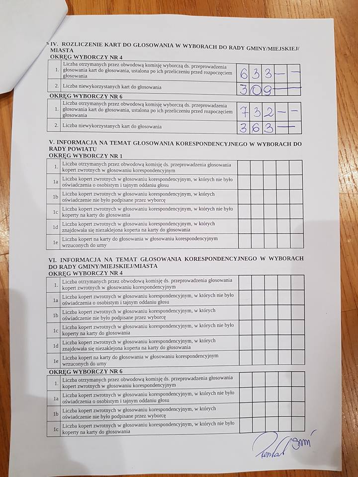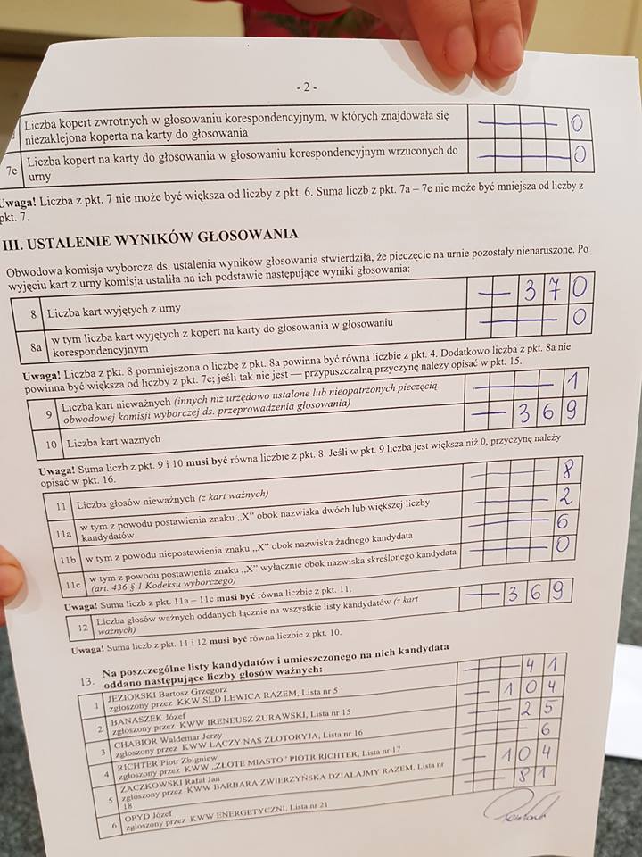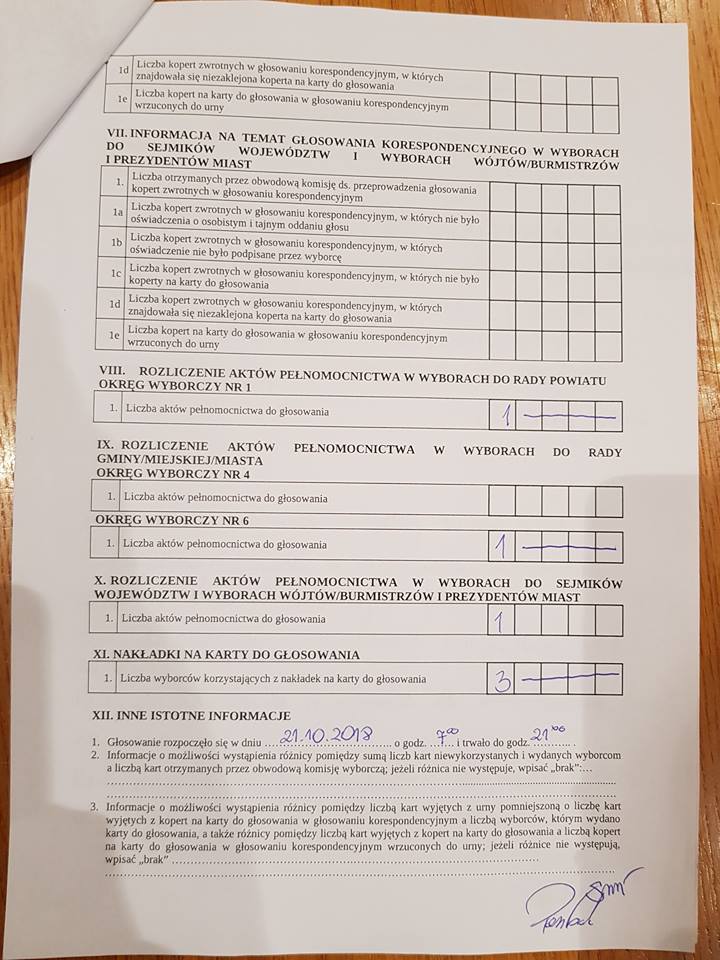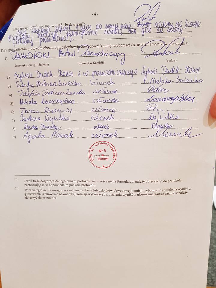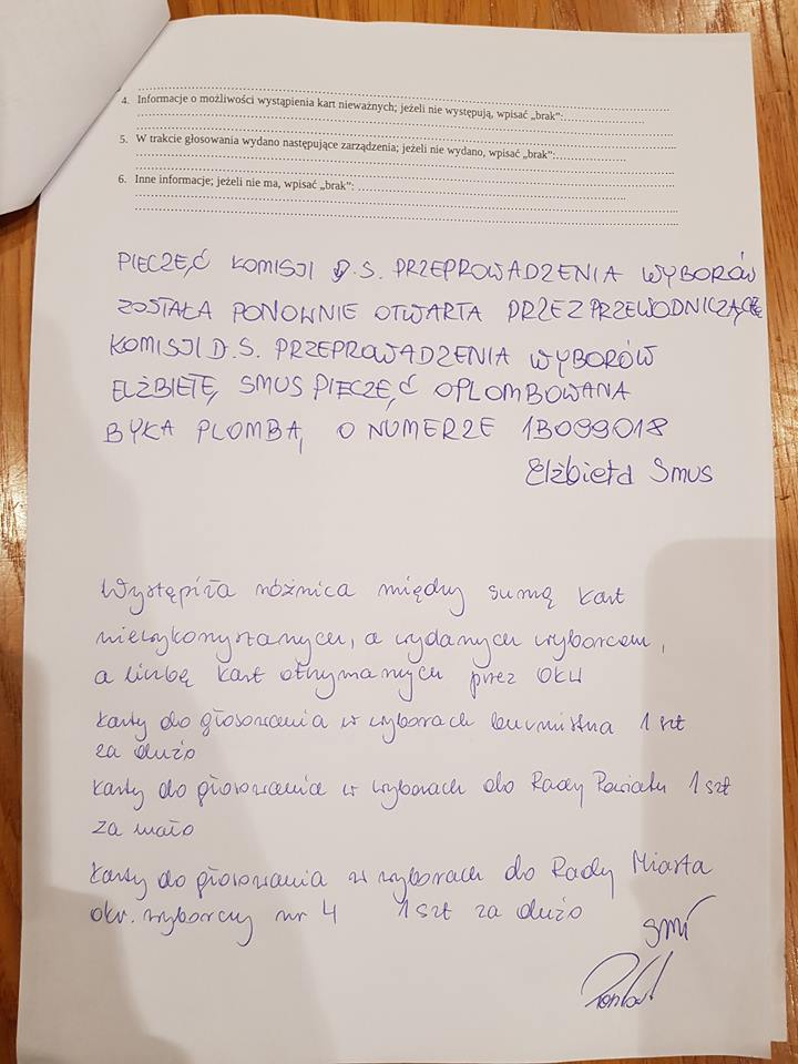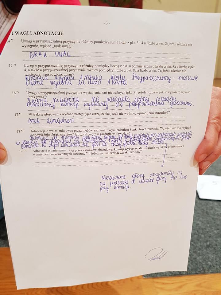 W uwagach i adnotacjach czytamy, że „możliwie błędnie została wydana jedna karta za dużo”, a także, że jedna z kart została unieważniona z powodu braku odpowiedniej pieczęci. Istotne tu mogą okazać się również zarzuty wniesione protokolarnie przez męża zaufania, który tak opisał tę sytuację: