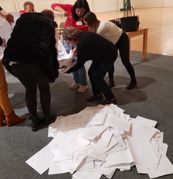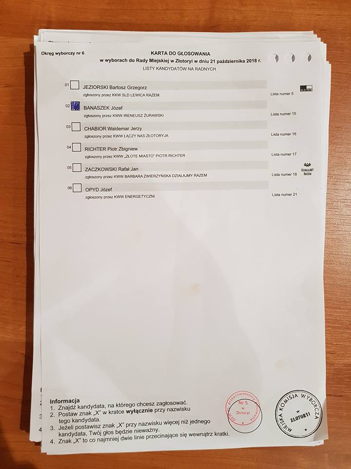 Komisja od momentu przeliczania głosów do rady miejskiej po trzech godzinach znalazła w kartach do głosowania na burmistrza jedną kartę z nazwiskiem (zaznaczonym) – Józef Banaszek. Po czym doliczono ten głos do reszty głosów rady miasta. Niezliczone głosy znajdowały się na podłodze, a zliczone głosy na stole przy komisji.