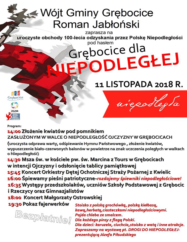 Honorową wartę przy pomniku trzymać będą druhowie z Ochotniczych Straży Pożarnych w replikach mundurów wojsk legionowych z 1918 roku, z maciejówką na głowie. Dzieci i młodzież wypuszczą w powietrze kilkaset biało-czerwonych balonów, by w ten sposób uczcić poległych w walkach o niepodległość. O godz. 14.30 w kościele parafialnym pw. św. Marcina w Grębocicach odprawiona zostanie uroczysta msza święta w intencji Ojczyzny, podczas której zostanie odsłonięta tablica upamiętniającą 100-lecie niepodległości. Po mszy, w pobliskim parku odbędzie się Piknik Niepodległościowy. Zaplanowano wspólne śpiewanie pieśni patriotycznych, koncert Orkiestry Dętej OSP Kwielice oraz występy dzieci i młodzieży szkolnej, a także przedszkolaków.