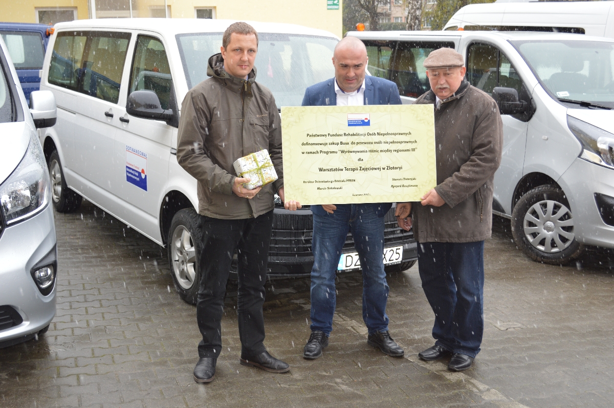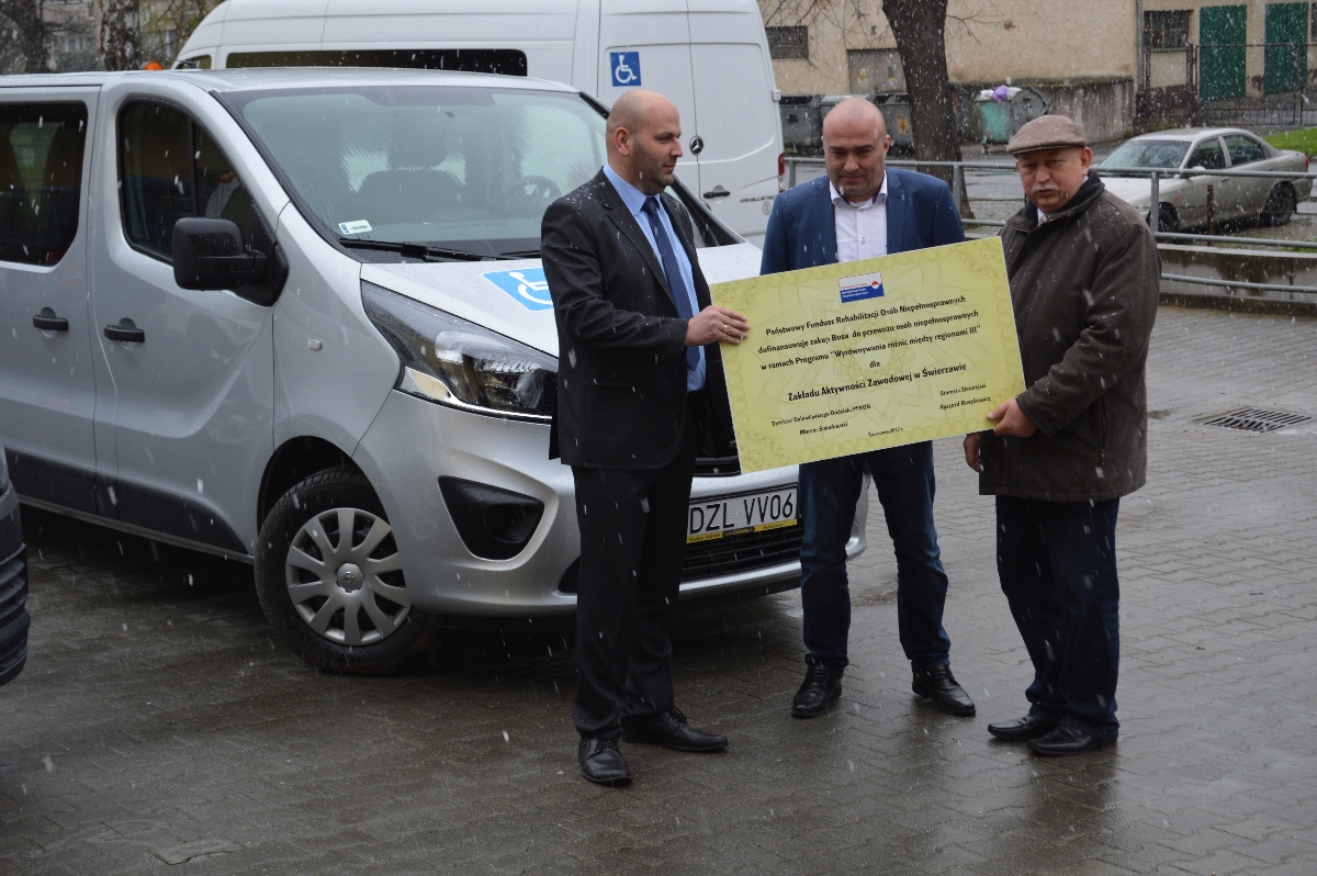 Uroczyste przekazanie nowych samochodów odbyło się na terenie świerzawskiego ZAZ-u w obecności dyrektora Dolnośląskiego Oddziału Państwowego Funduszu Rehabilitacji Osób Niepełnosprawnych we Wrocławiu Marcina Sokołowskiego i starosty złotoryjskiego Ryszarda Raszkiewicza.