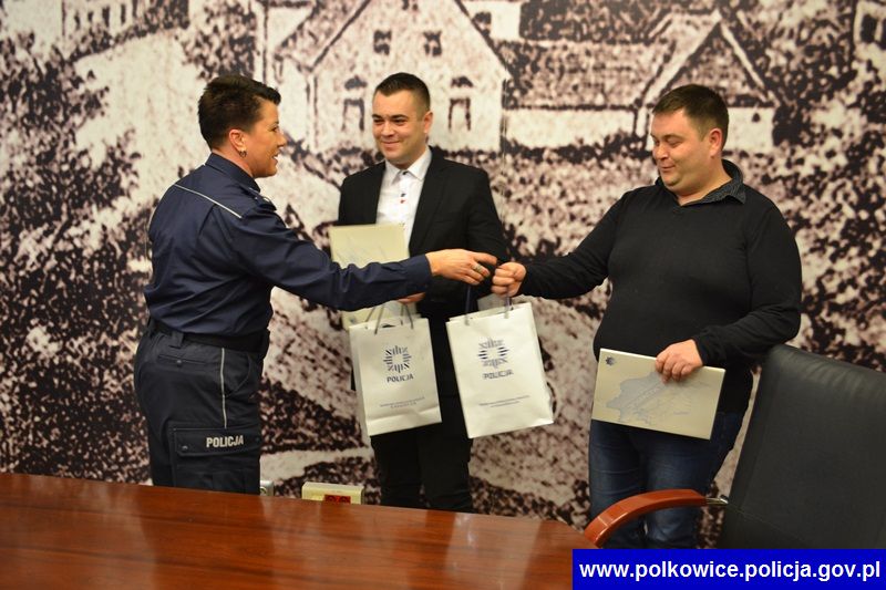 Listy gratulacyjne oraz drobne upominki odważnym mężczyznom wręczyli zastępca Komendanta Powiatowego Policji w Polkowicach nadkom. dr Joanna Cichla i burmistrz gminy Wiesław Wabik podczas wczorajszego spotkania w ratuszu.